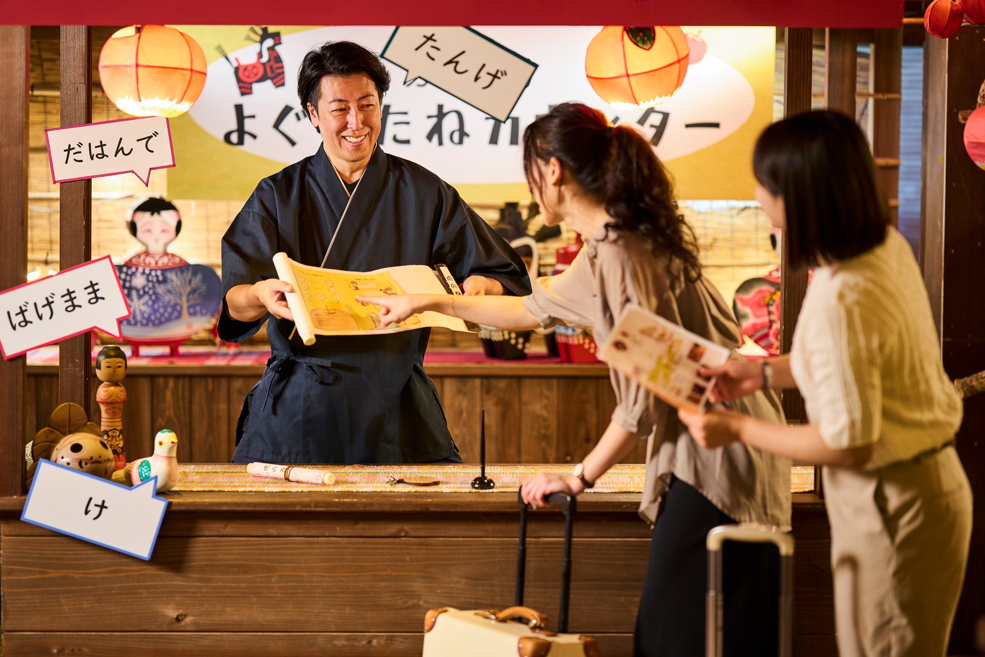 青森の文化を目一杯満喫できる温泉宿「青森屋 by 星野リゾート」では、2025年4月2日から、方言だけのチェックインからスタートする、青森旅をディープに楽しむプログラムを提供します。2025年春に新登場の方言専用チェックインカウンターは、青森の方言で館内案内を受けられるのが特徴です。さらに、クイズを解いて楽しむ方言クロスワードにも挑戦できます。他にも、青森の方言講座「これであなたも『あおもリンガル(*1)』」や「津軽弁ラジオ体操」などに参加して青森文化に浸ることで、青森旅をよりディープに楽しむことができます。
