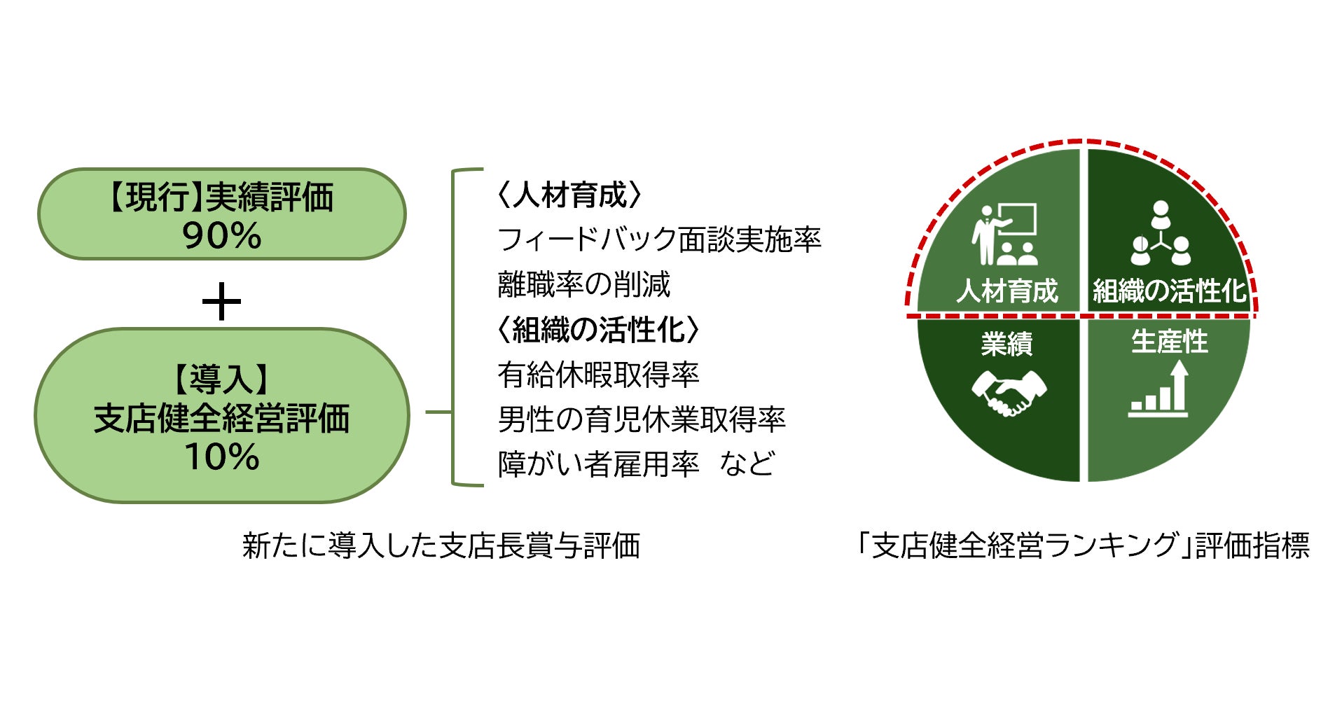 営業実績のみの評価を見直し、支店長の経営視点意識向上と人的資本経営の推進を図る