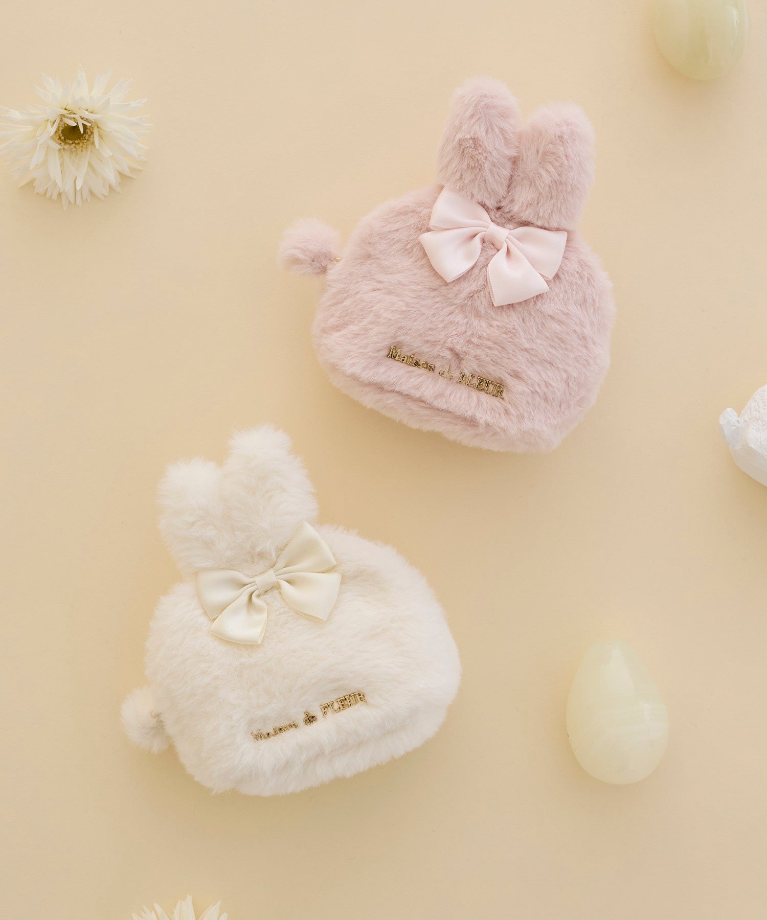うさぎとリボンモチーフをあしらったデザインは、フリルハンドルバッグ、ポーチ、ラビットチャームの3型。サテン生地にレースを重ねたバッグと、ふわふわのフェイクファーを使用したラウンド型のポーチには、“うさ耳”デザインを採用。ポーチには、しっぽをイメージしたファーをファスナーの引き手に取り付けました。また、Maison de FLEURで人気のラビットチャームは、ローズとリボンでおめかししたイースターならではのデザインに仕上げました。