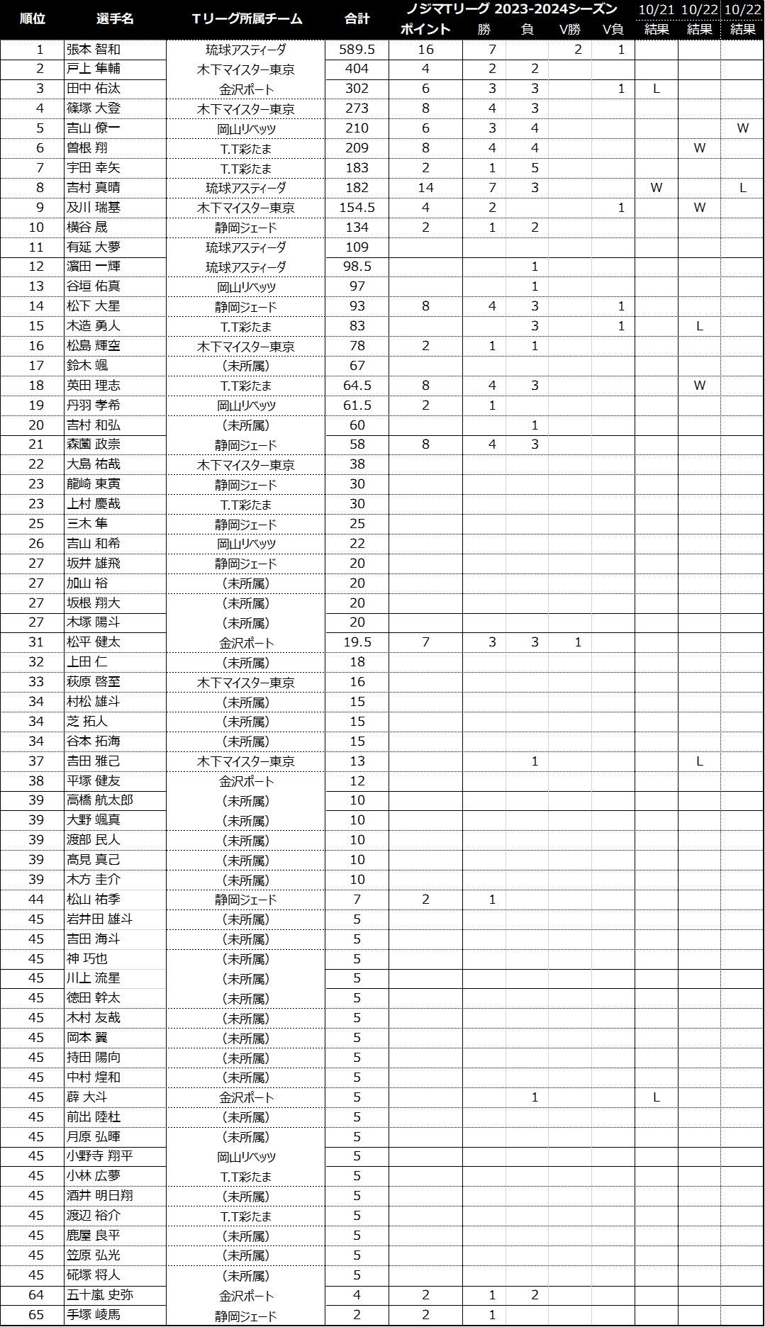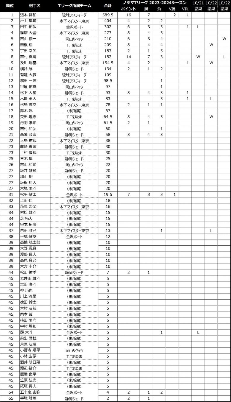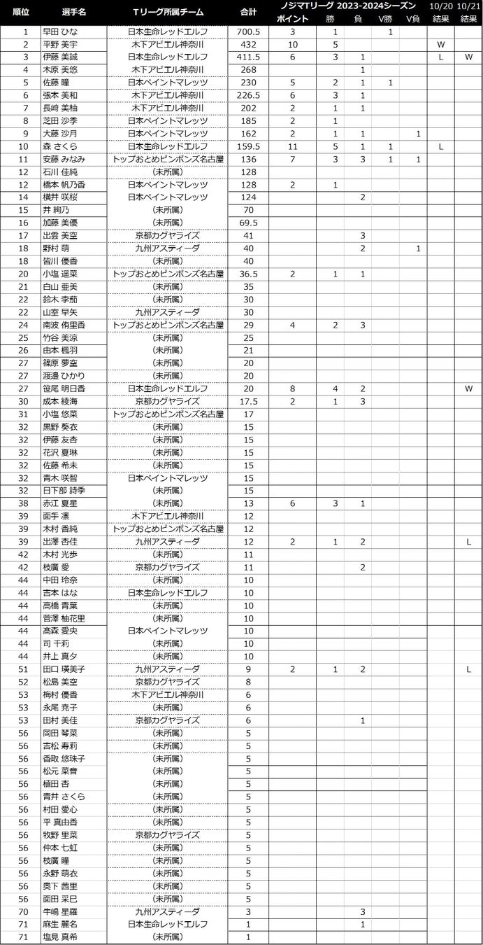 ノジマTリーグ 2023-2024シーズンにおける、「2024パリオリンピックシングルス選考ポイント 」の獲得状況をお知らせします。(ノジマTリーグ 2023-2024シーズン公式戦 10/22開催試合終了時)