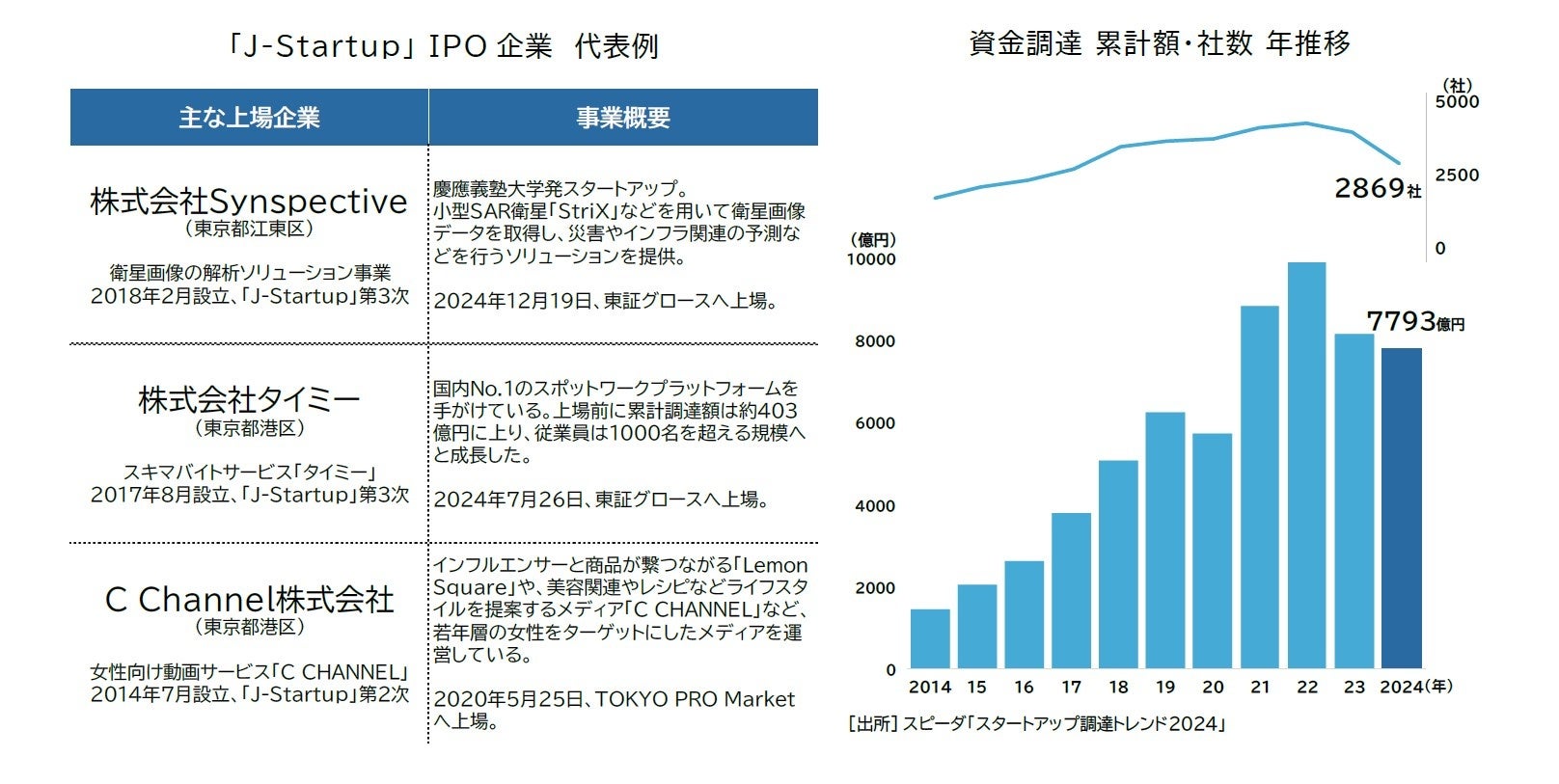 2018年に政府が閣議決定した成長戦略「未来投資戦略2018」では、ユニコーン(時価総額が10 億ドル以上の未上場企業)の数が世界と比べて少ないことから、「ユニコーンを2023年までに20社創出する」という目標が定められた。そうした背景によって開始されたプログラムがJ-Startupであり、その目標こそ達成できなかったものの、事業を拡大し世界で活躍する企業を多数輩出している。日本国内でIPOを果たした企業は21社(その他、J-Startup選定以前から上場承認されていた企業は11社)に上り、前述したタイミーやSynspectiveがその代表例である。