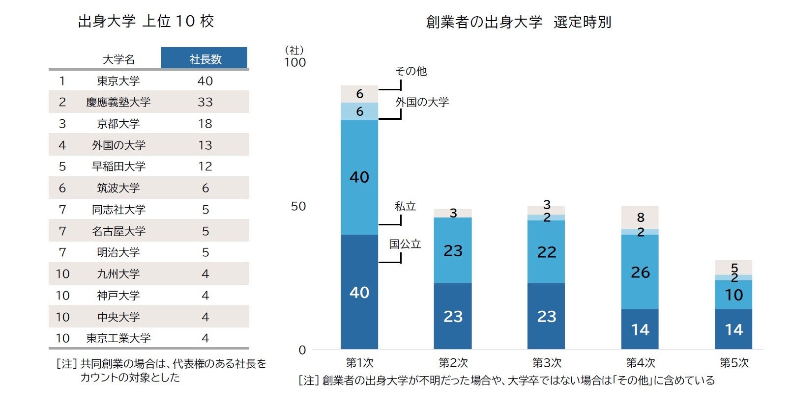 累計では、国公立大学が114社、私立大学が121社となり大きな差はなかった。また、高校卒業後に起業したケースもあった(大学の休退学・在学中も含む)。