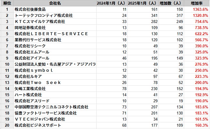 ・2024年1月時点と2025年1月時点の従業員数を比較