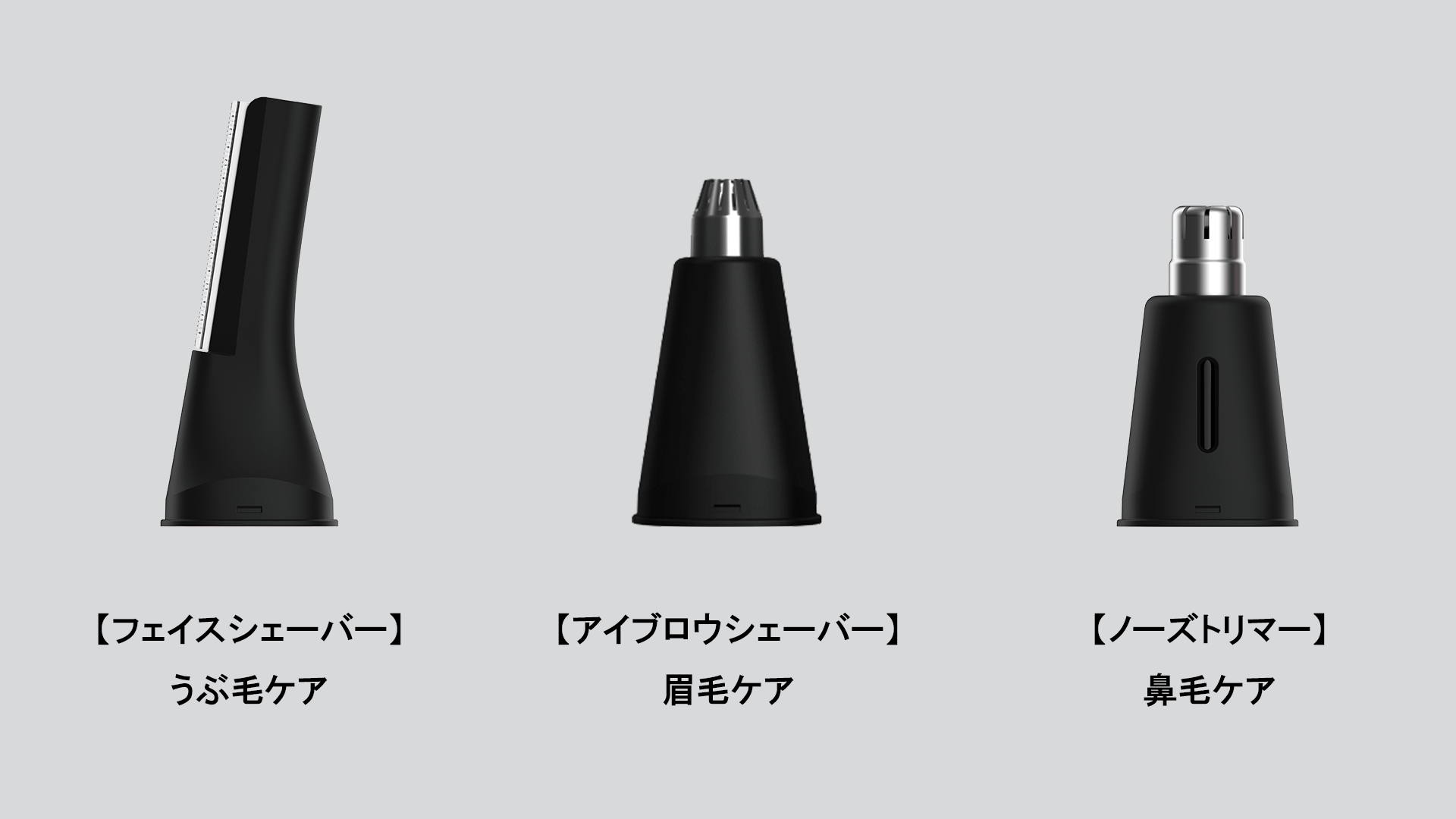 ②3種類の付け替え可能なアタッチメント(刃)で繊細な調整ができ、1本でフェイスシェーバー(うぶ毛ケア)・アイブロウシェーバー(眉毛ケア)・ノーズトリマー(鼻毛ケア)の3役をこなします。