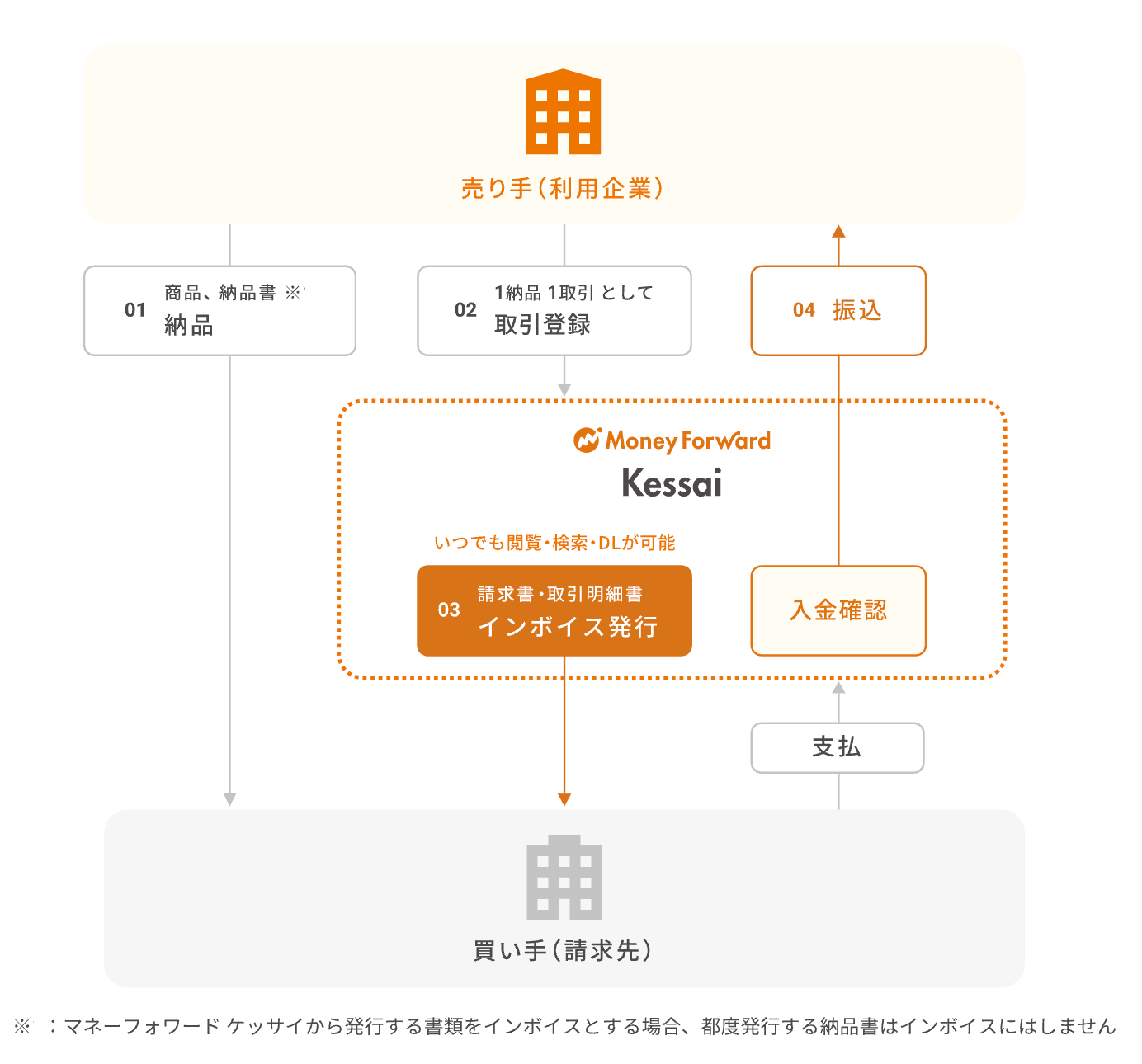 ※2 買い手側は仕入税額控除を受けるために必要なインボイスを受領でき、電帳法の法的要件を満たした請求書クラウド管理サービス『マネーフォワード ケッサイ インボックス』を無料で利用できます。