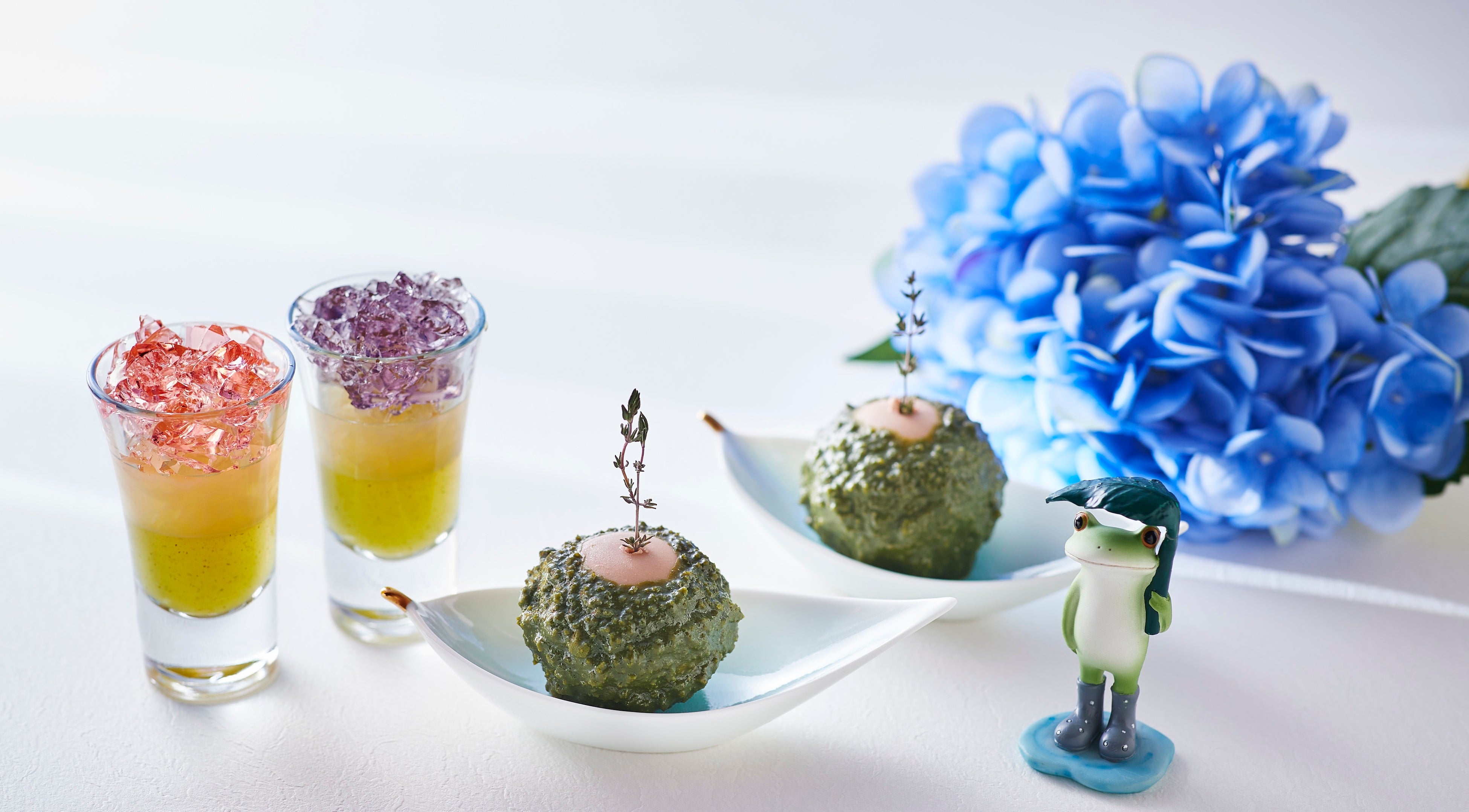 さらに、雨の日を楽しんでいただけるよう、雨の日限定メニューとして「紫陽花ゼリーソーダ」が登場します。またフードにも、「アールグレイ風味の冷製ポテトスープ」、「抹茶風味のポテトサラダと小海老」や「茶そば」などお茶を感じていただける料理や、「リーガロイヤルホテルのカレーライス」、「貝類とアスパラガスのペンネ」、「焼きたて窯焼き 本日のピザ」などのフードも充実しています。