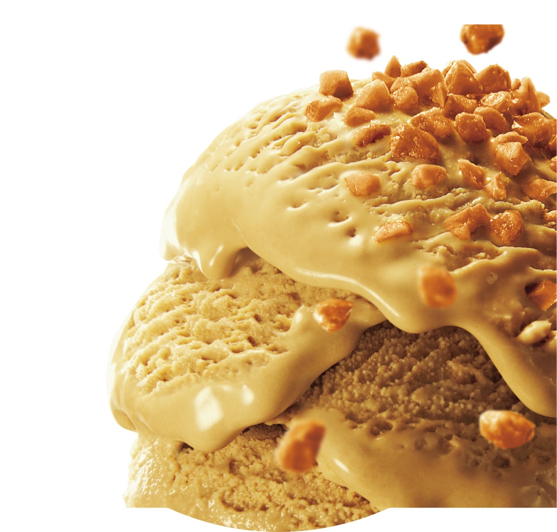 ①濃厚なキャラメルアイスに、キャンディーコートしたヘーゼルナッツをトッピングしました。