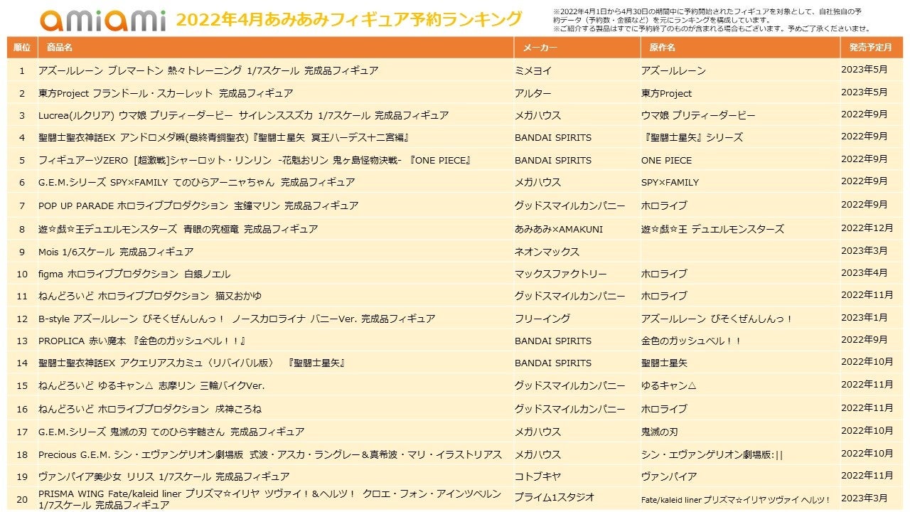 「アズレン」「東方Project」「ウマ娘」「ホロライブ」など人気タイトルの美少女キャラクターはもちろん、人気アニメ「SPY×FAMILY」のキャラクターもランキングに初登場です。『2022年4月あみあみフィギュア予約ランキング』にご注目ください。