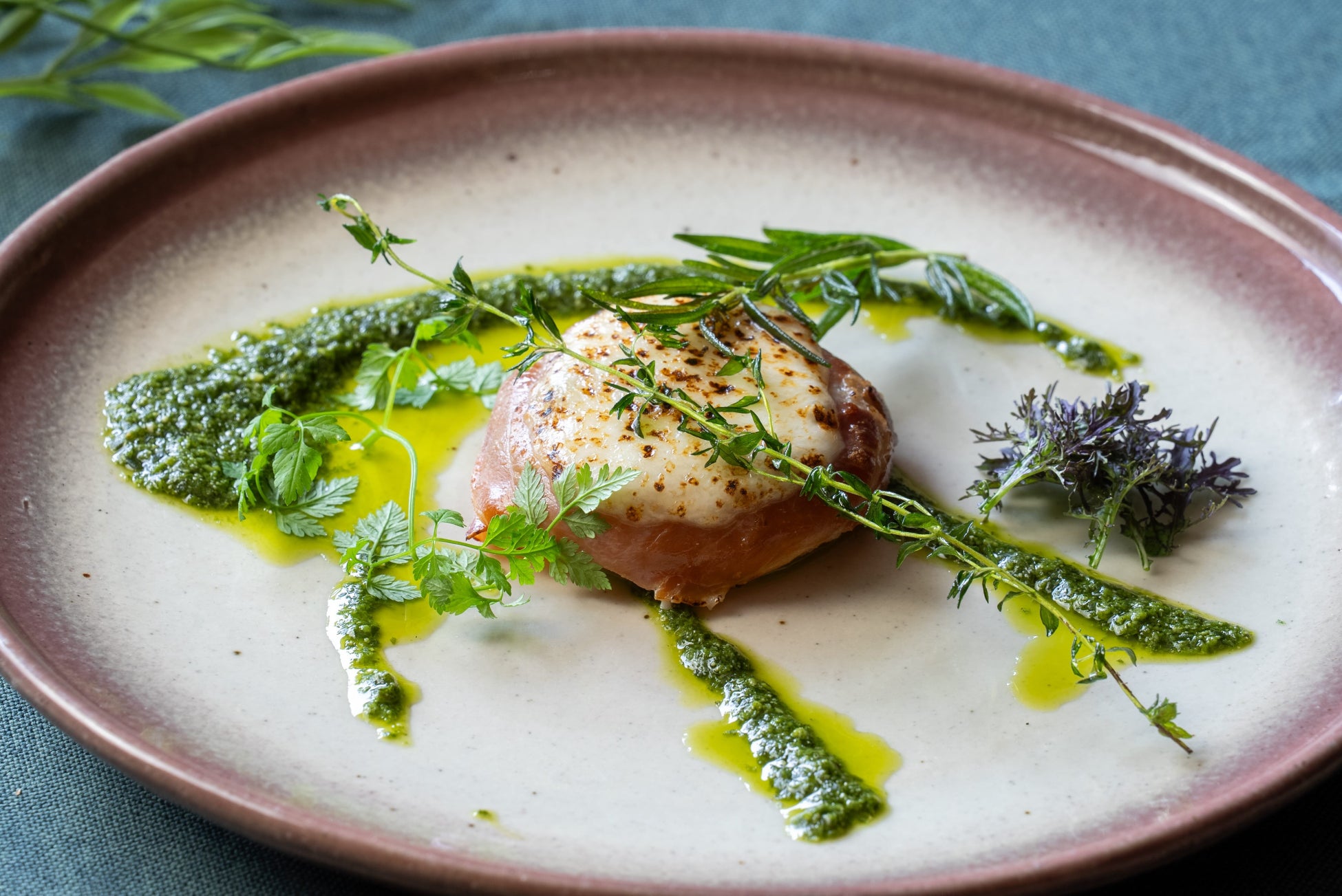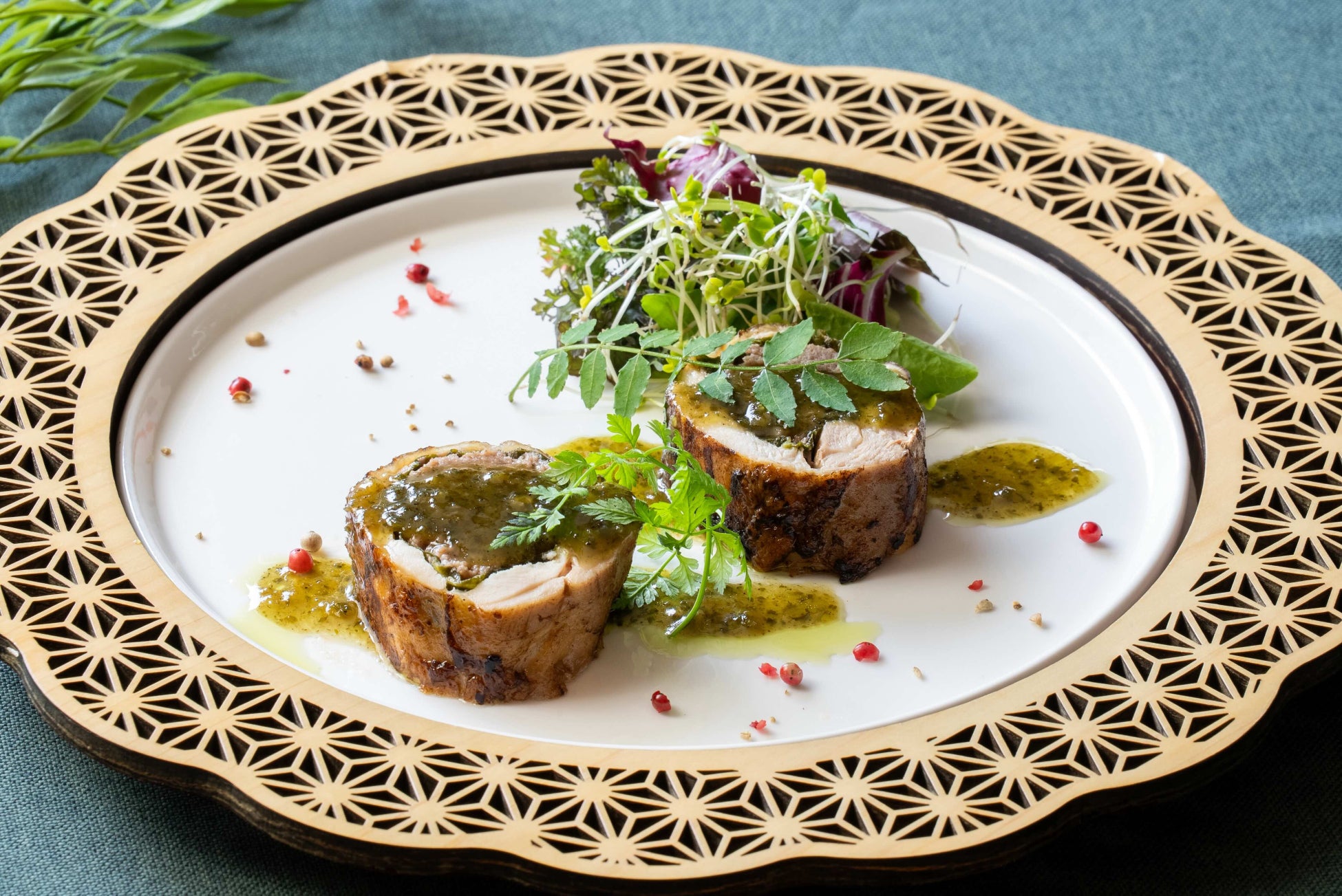メイン:鶏肉のガランティーヌ ときがわ町の名産品“山椒”を散らしたソースと共に