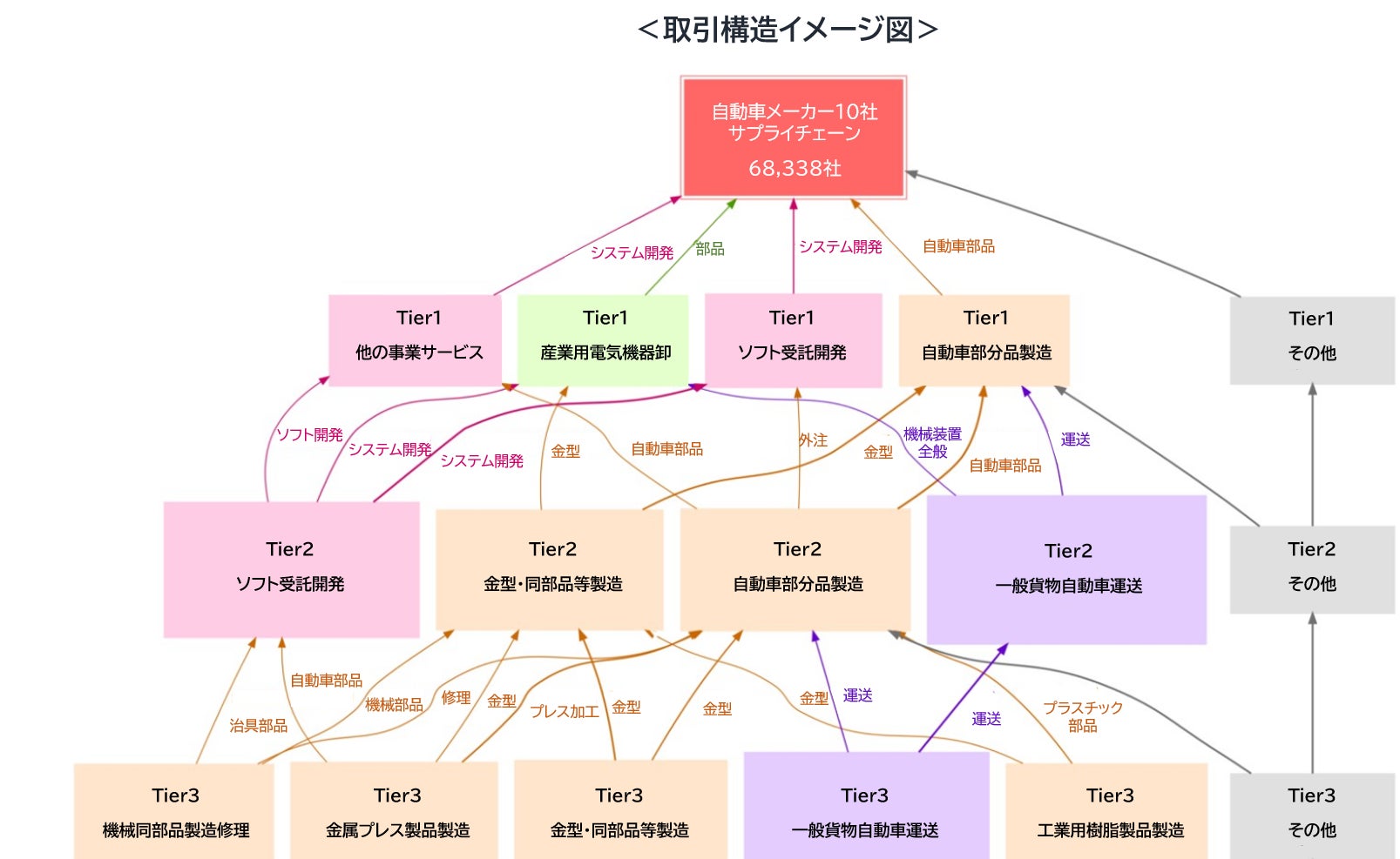 EV化やSDV化の流れのなかで、ハードウェアに相対してソフトウェアの重要性が年々高まっている。また、生産ラインのFA化・省力化が進んでおり、2018年時点からTier1のトップ業種は「自動車部分品・付属品製造業」から「受託開発ソフトウェア業」へ交代している。ソフトウェアの開発力がプロダクトコストや商品力の差別化を左右する新たな時代が到来したといえる。なお、取引構造イメージ図を示し自動車サプライチェーンの広がりを可視化した。