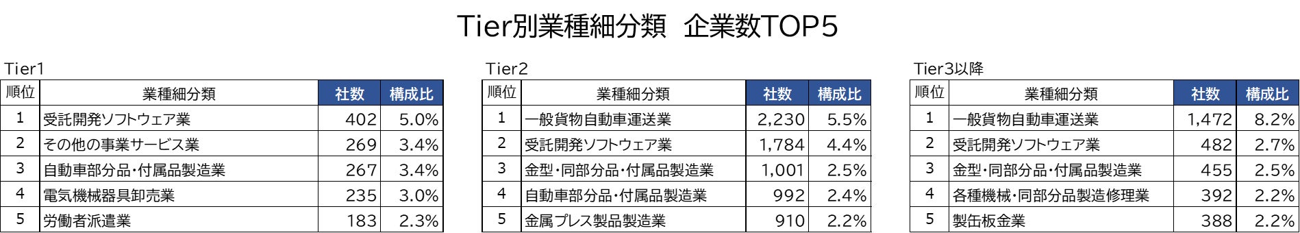 業種別にみると、Tier1は「受託開発ソフトウェア業」が402社で最多となった。以下、「その他の事業サービス業」(269社)、「自動車部分品・付属品製造業」(267社)、「電気機械器具卸売業」(235社)と続いた。Tier2は、「一般貨物自動車運送業」が2,230社でトップ、以下、「受託開発ソフトウェア業」(1,784社)、「金型・同部分品・付属品製造業」(1,001社)が上位となった。Tier3以降でも、「一般貨物自動車運送業」が1,472社でトップ、「受託開発ソフトウェア業」(482社)、「金型・同部分品・付属品製造業」(455社)と続いた。