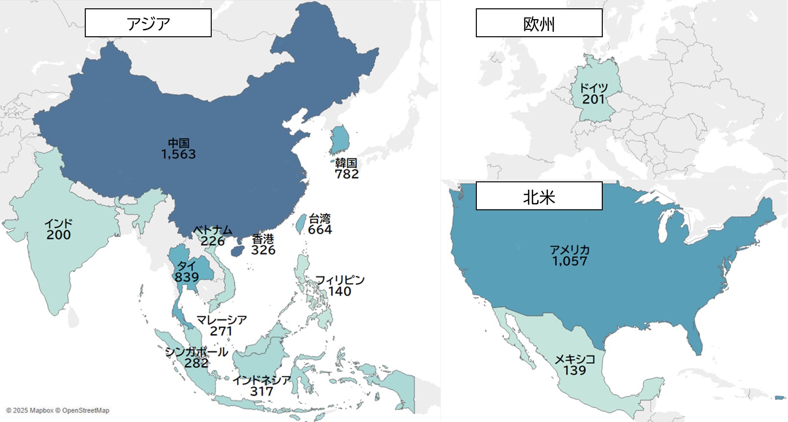 輸出国が判明した企業をみると、中国への輸出が1,563社と最も多く、アメリカが1,057社と続いた。また、多くのアジア諸国が上位に位置しており、自動車産業のサプライチェーンがアジア地域に深く根付いていることがわかる。