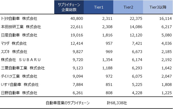 2024年12月時点の国内自動車メーカー10社のサプライチェーン企業数は68,338社であった。メーカー別にみると、トヨタ自動車が最も多く40,800社、本田技研工業が22,611社、日産自動車が19,016社と続いた。