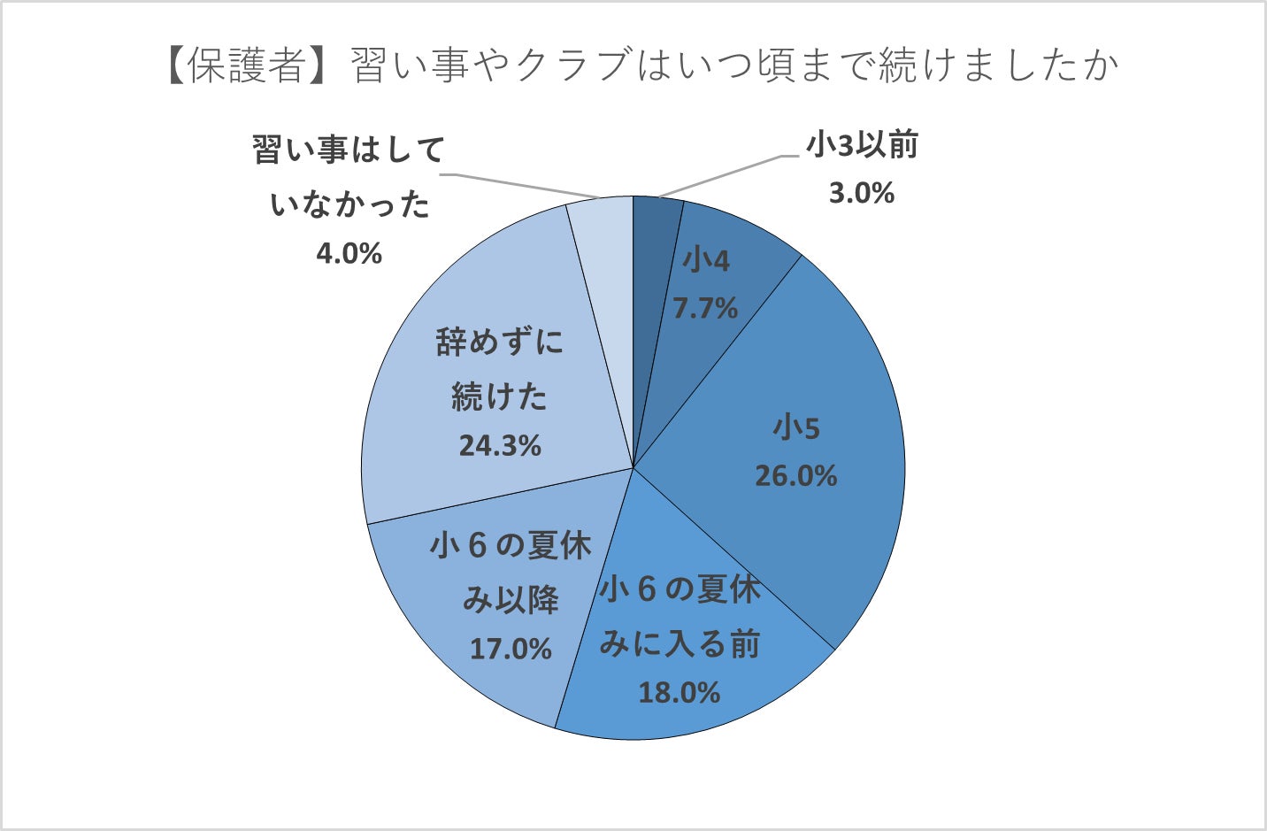 受験生の保護者に、習い事やクラブを続けた時期を聞いたところ、24.3%が「辞めずに続けた」と回答し、約4人に1人の受験生にのぼった。また、習い事やクラブを辞めた家庭でも、小5・小6まで続けた受験生も多く、中学受験の勉強が本格化する小4以降も、中学受験の勉強と習い事・クラブを両立している受験生が多いことが明らかとなった。