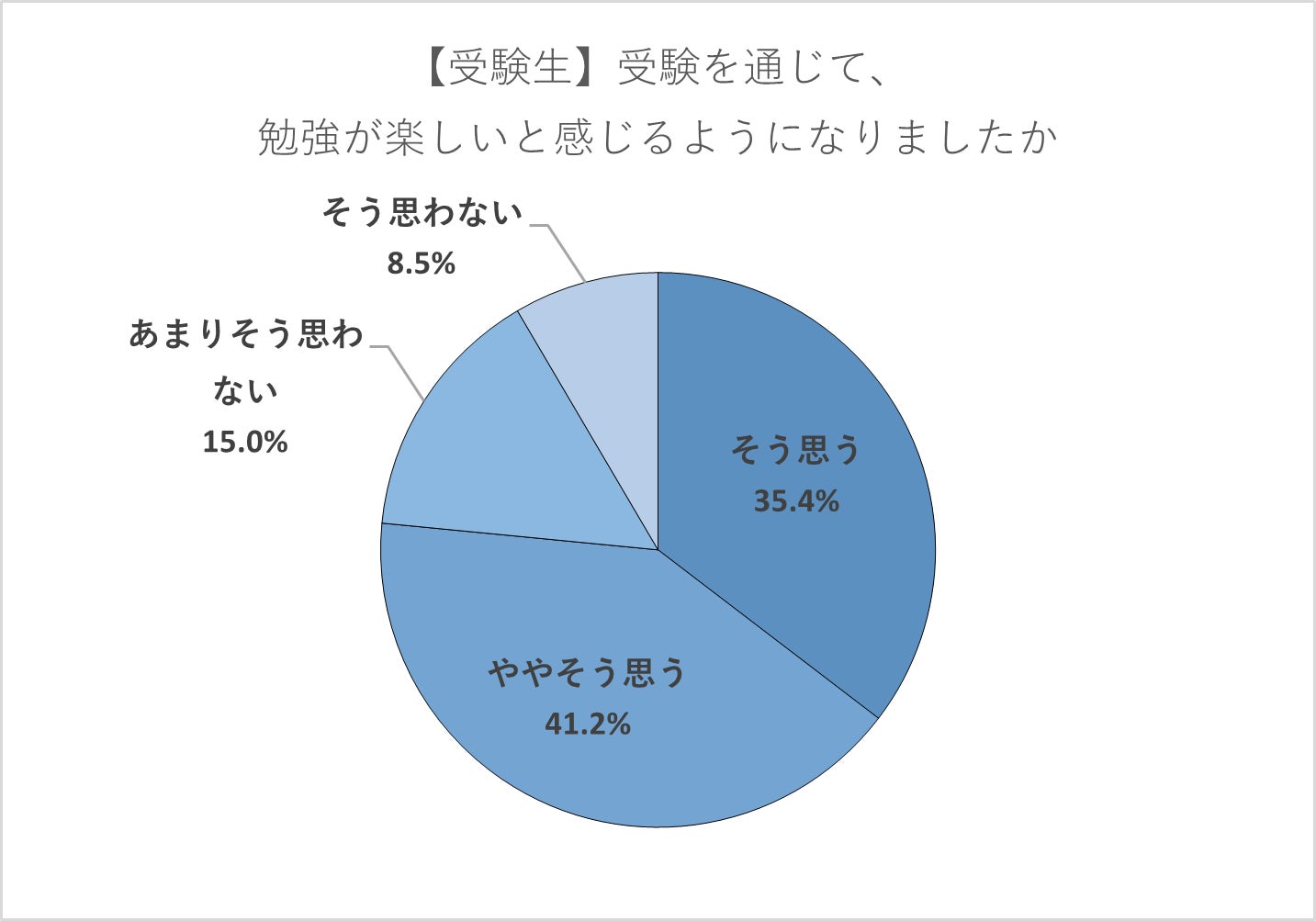 受験生に、受検を通じて勉強が楽しいと感じるようになったかを聞いたところ、「そう思う」が35.4%、「ややそう思う」が41.2%となり、4分の3以上の受験生が「勉強を楽しいと感じる」ようになったことが分かった。