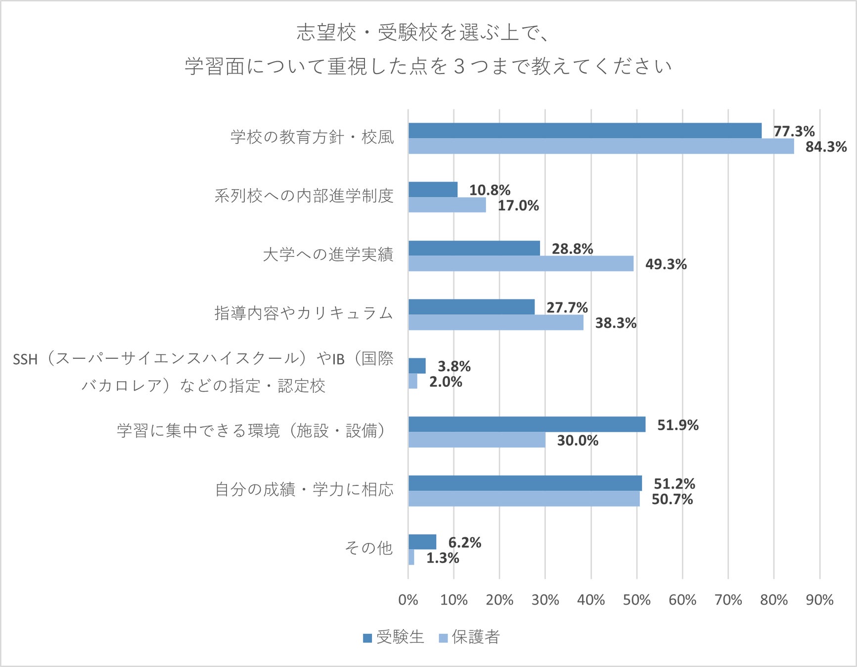 受験生・保護者ともに最も重視したポイントは「学校の教育方針・校風」で、受験生の77.3%、保護者の84.3%にのぼった。受験生と保護者の回答を比較すると、受験生は「学習に集中できる環境(施設・設備)」をより重視している一方、保護者は「大学進学への実績」「指導内容やカリキュラム」をより重視していることが明らかとなった。