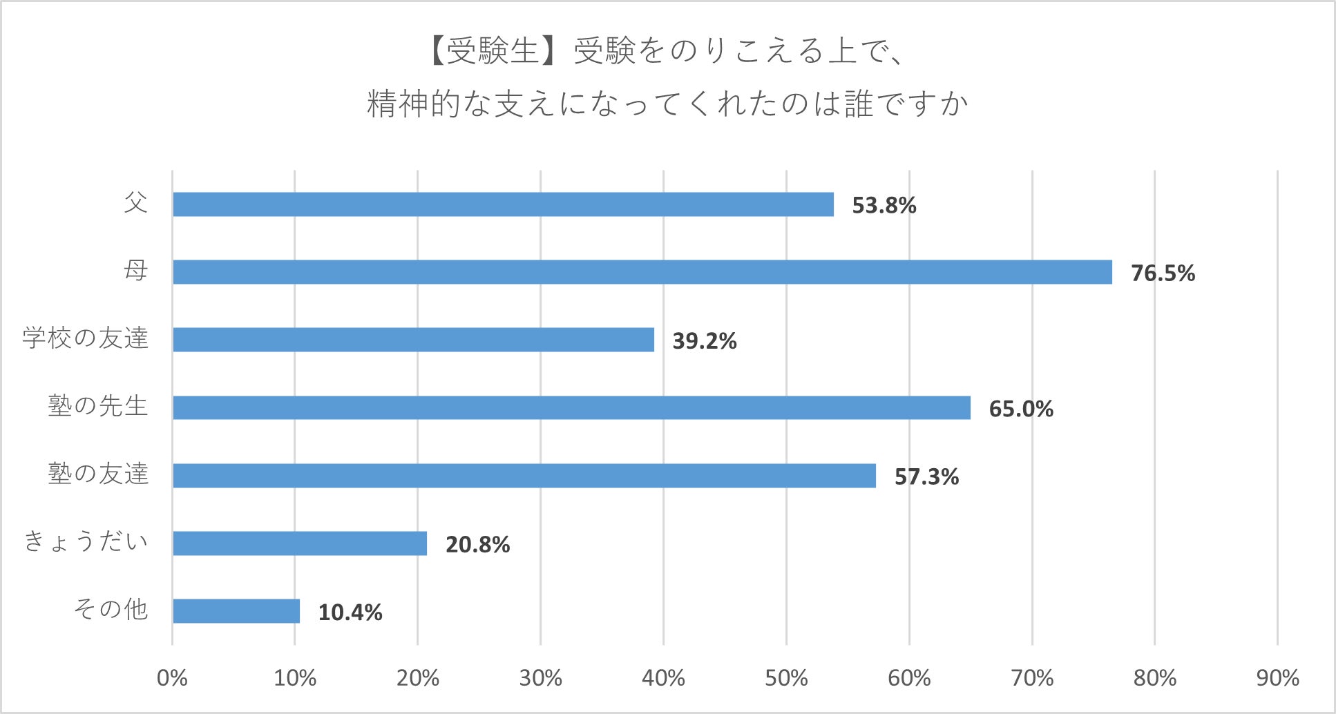 受験生に、受験を乗り越える上で精神的な支えとなった人を聞いたところ、「母」が76.5%と最も高く、次いで「塾の先生」が65.0%にのぼり、受験生にとって、周囲の大人が支えとなっていることがわかった。