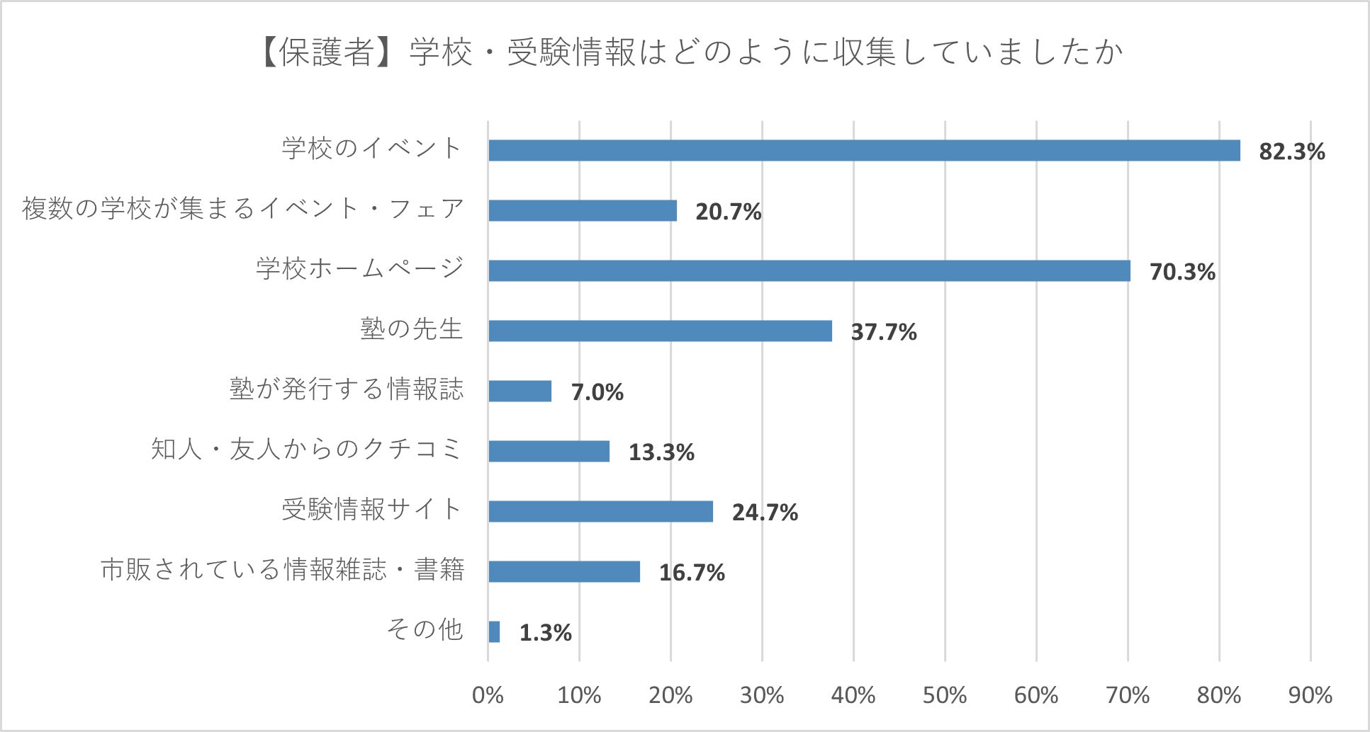 保護者に、学校や受験情報をどのように収集していたか聞いたところ、「学校のイベント」が82.3%と最も多く、次いで「学校ホームページ」が70.3%となった。多くの家庭で、学校が発信する情報を活用していることが分かった。