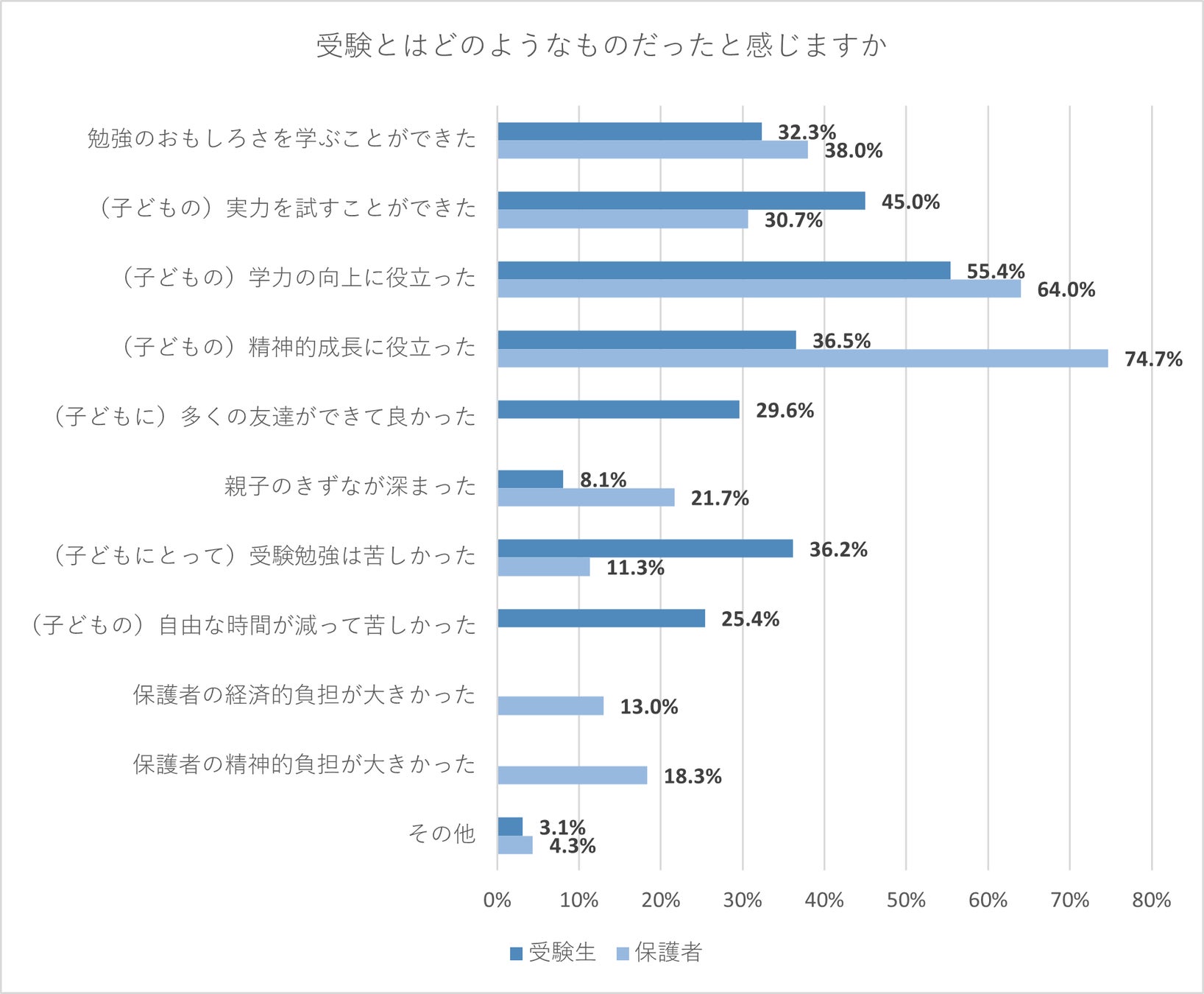受験生の回答が最も多かったのは「(子どもの)学力の向上に役立った」で、55.4%だった。保護者は、「(子どもの)精神的成長に役立った」が最も多く、74.7%にのぼった。