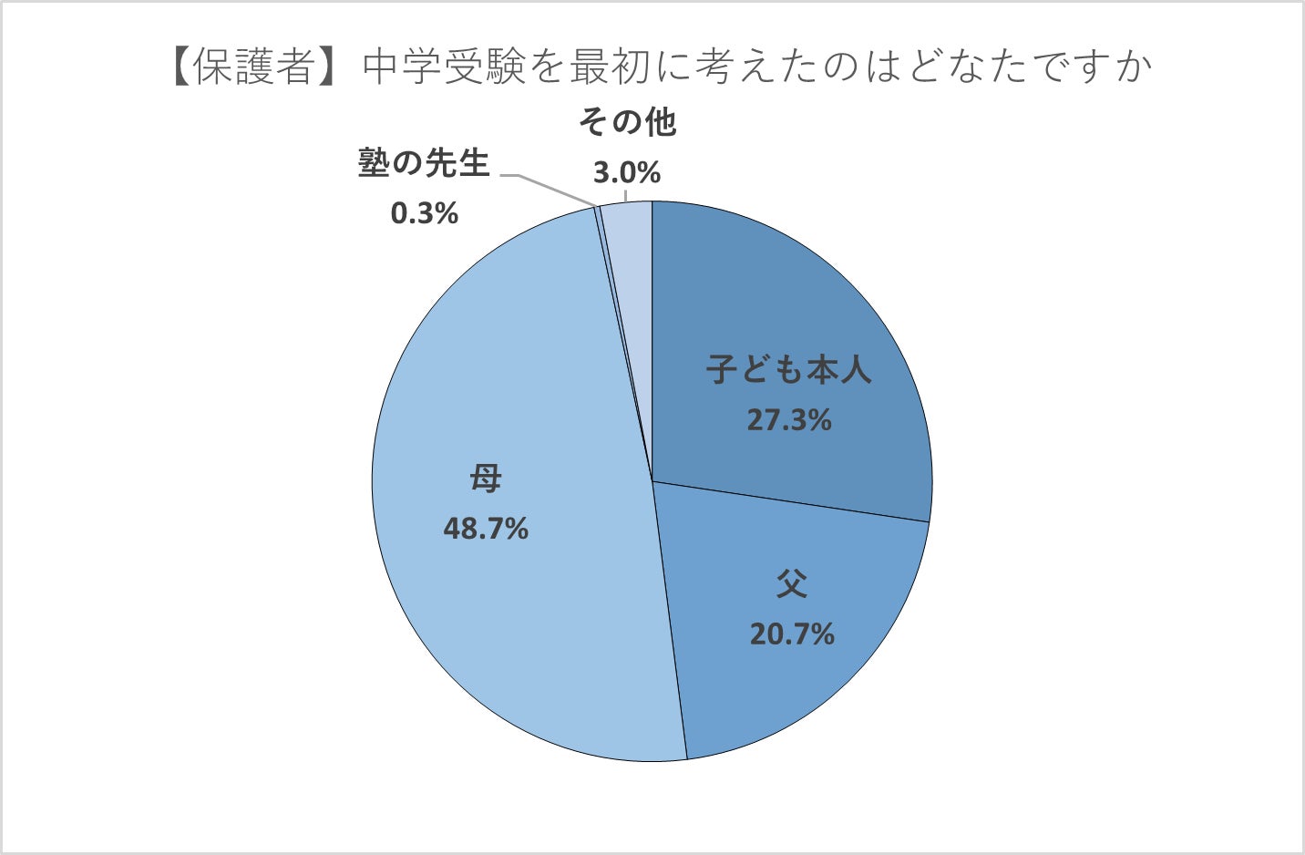 受験生の保護者に、最初に中学受験をしようと考えた人を聞いたところ、48.7%の保護者が「母」と回答した。次いで、「子ども本人」が27.3%、「父」が20.7%だった。