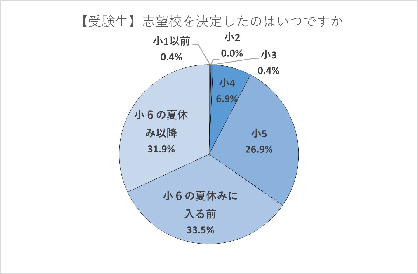 志望校を決めた時期を受験生に聞いたところ、「小6の夏休みに入る前」が最も多く33.5%、「小6の夏休み以降」が31.9%と続いた。