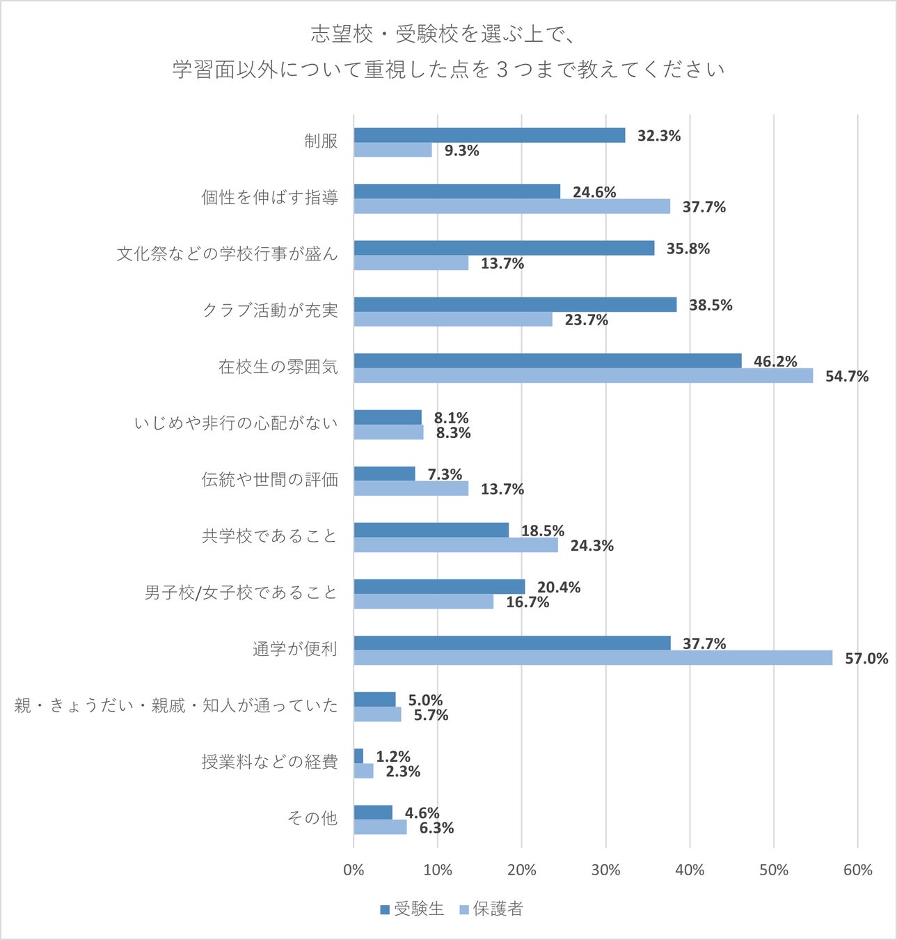 受験生は「制服」「文化祭などの学校行事が盛ん」「クラブ活動が充実」など、6年間の学校生活や行事も重視しており、保護者は「個性の伸ばす指導」「在校生の雰囲気」「通学が便利」といった項目を、受験生よりも重視していることが分かった。