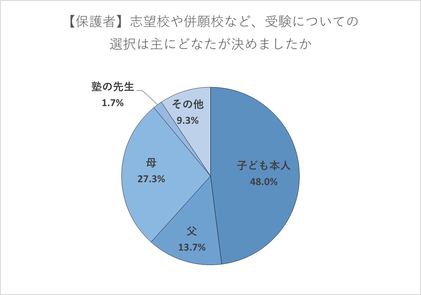 受験生の保護者に、受験についての選択は主に誰が決めたかを聞いたところ、48.0%の保護者が「子ども本人」と回答した。中学受験を最初に考えるのは子どもよりも保護者の方が多いが、中学受験を決めてからの学校選びなどは、受験生本人が主体となって決めていることが分かった。