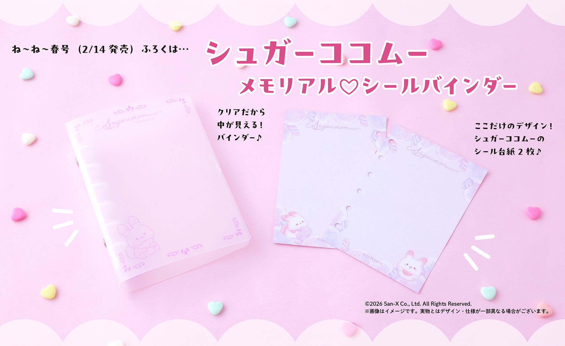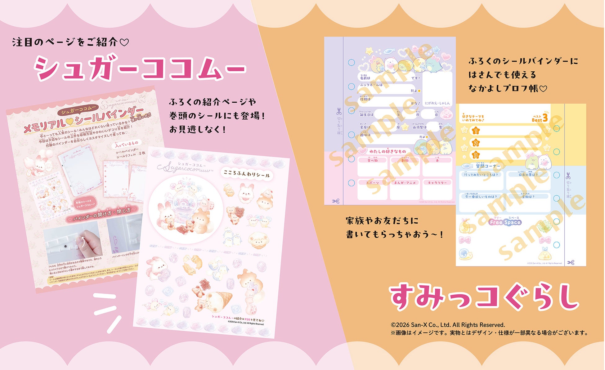 ねーねーだけでしか手に入らないふろくは……「シュガーココムー メモリアル♡シールバインダー」! クリア表紙のシールバインダーとリフィルのセットだよ。自分好みにカスタマイズして使ってね★ シュガーココムーの紹介や、シールバインダーの使い方の紹介ページも今回の号には掲載しているので要チェック!! とじこみふろくの「すみっコぐらし きらりんなかよしプロフ帳」を切って手帳に使うのもオススメだよ。