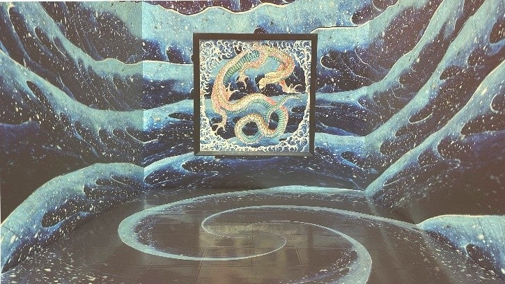 今回は本展覧会の最終章でご紹介している、北斎が晩年に小布施で制作に携わった東町祭屋台・上町祭屋台およびその天井絵を題材としています。祭屋台を人々が囲んでいる当時の町の様子から始まり、東町祭屋台天井絵「龍」「鳳凰」、上町祭屋台天井絵「男浪」「女浪」、そして北斎が挿絵を担当した『新編水滸画伝』にも登場した上町祭屋台の飾人形「皇孫勝」「応龍」が表現する世界観を、没入型の体感展示でご鑑賞いただけます。北斎が東町祭屋台・上町祭屋台を通じて表現しようとした世界をご体感ください。