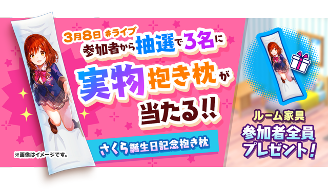 また、誕生日当日には誕生日記念#ライブの開催を予定しております。本#ライブでのみ使用できる「エール」が登場するほか、参加者全員にルームで使用できる「さくら抱き枕」をプレゼントいたします。さらに、#ライブに参加した方の中から抽選で本物の「さくら抱き枕」をお届けいたします。