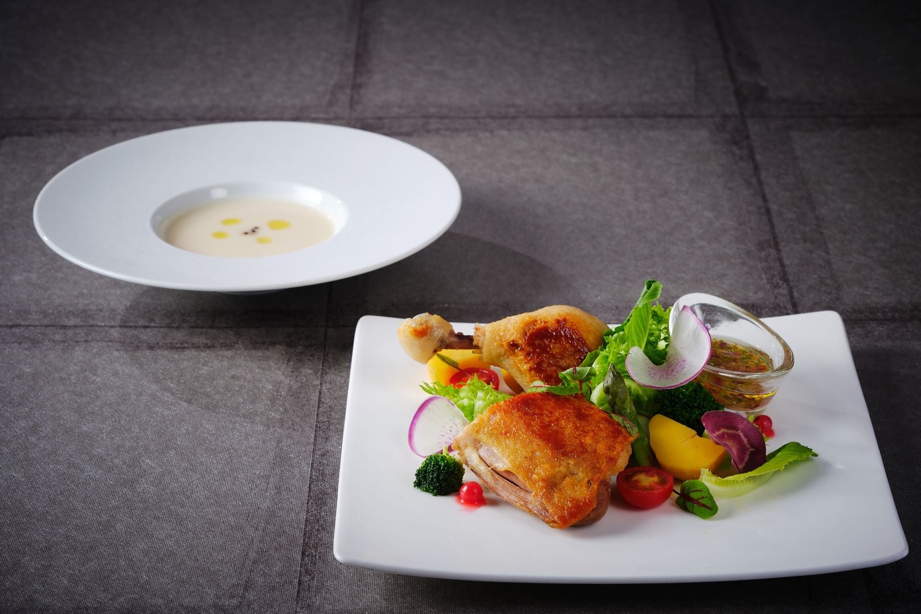 ・ランチB:彩り野菜のサラダと鶏もも肉のコンフィ/カリフラワーのスープ
