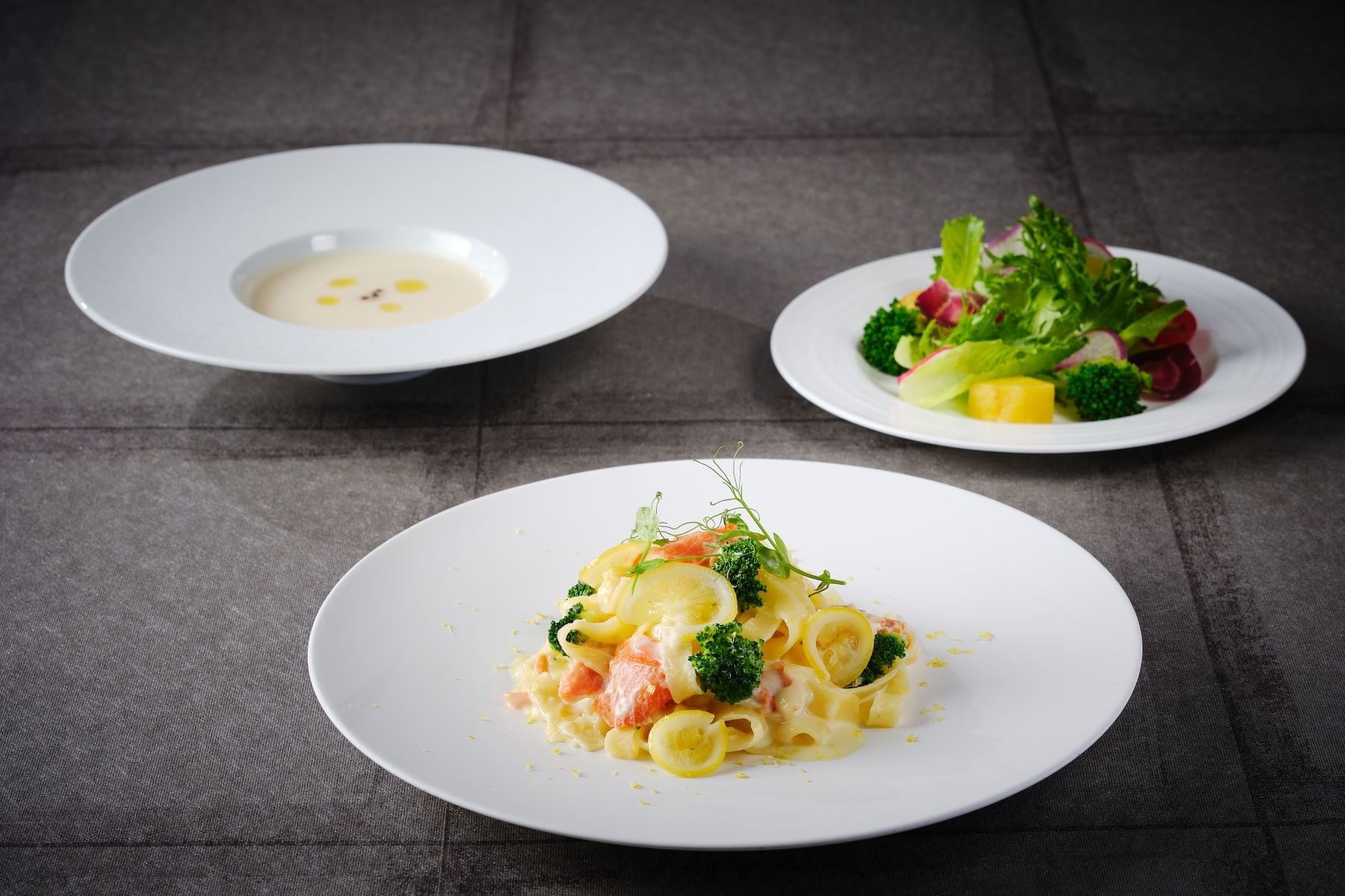 ・ランチA:サーモンマリネとブロッコリーのレモンクリームパスタ/カリフラワーのスープ/