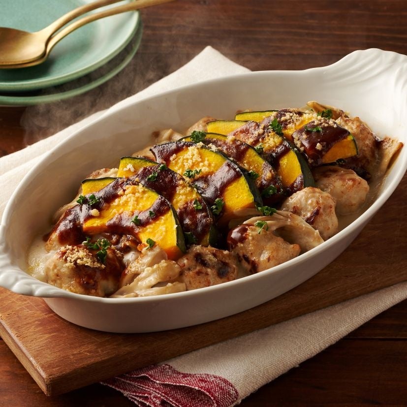 概要:DEAN & DELUCA監修メニュー。ゴロッとしたミートボールに甘くホックリしたかぼちゃをのせて焼いて10分で仕上げます。食材を重ねる順番を工夫し、濃厚なデミグラスソースがおいしさのポイント。ホワイトソースと合わせることで、さらに贅沢な味わいに。クリスマスに、お子さまから大人までワイワイ楽しめます。