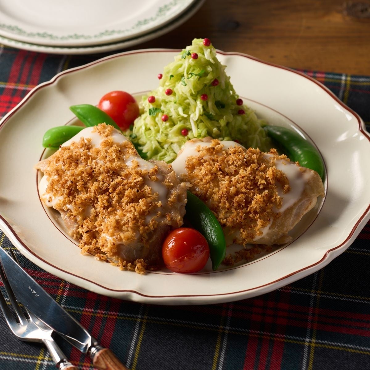 概要:聖夜を彩るメニューを簡単に!ホワイトソースを乗せてフライパンで蒸し焼きにしたチキンに、マヨネーズが隠し味のガーリックパン粉が重なって、お店のような味わいに。りんごのドレッシングで作るシンプルコールスローとご一緒に、クリスマスのディナーをお楽しみいただけます。