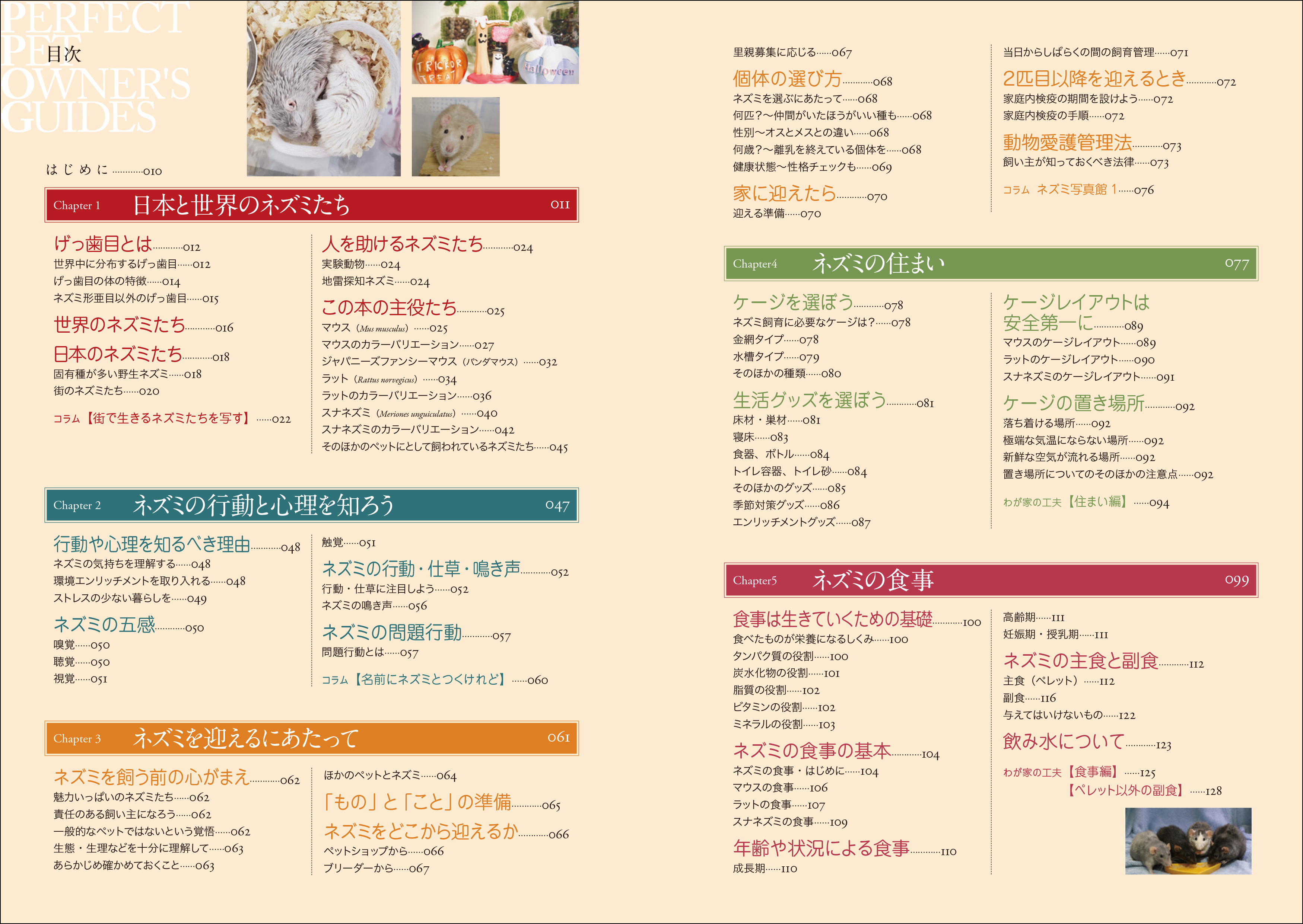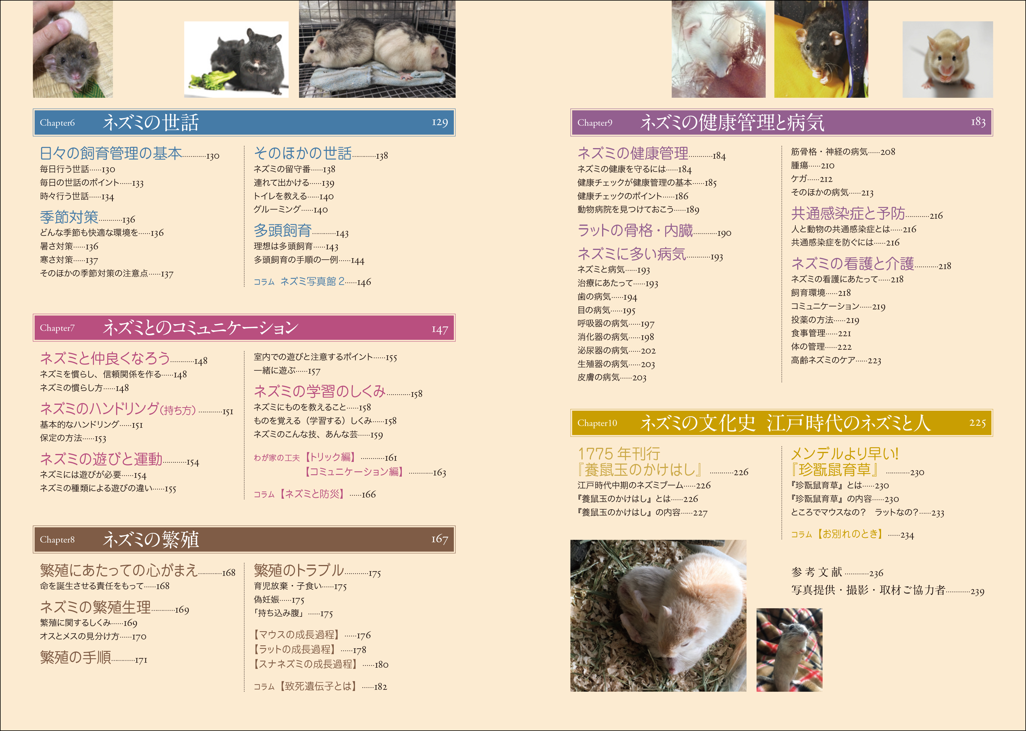 本書では彼らのことをよく知って、よりよい暮らしを提供することがネズミたちも飼い主もますますハッピーになれることをモットーに、マウス、ラット、スナネズミの知識や情報、飼育管理のノウハウをていねいに紹介しています。