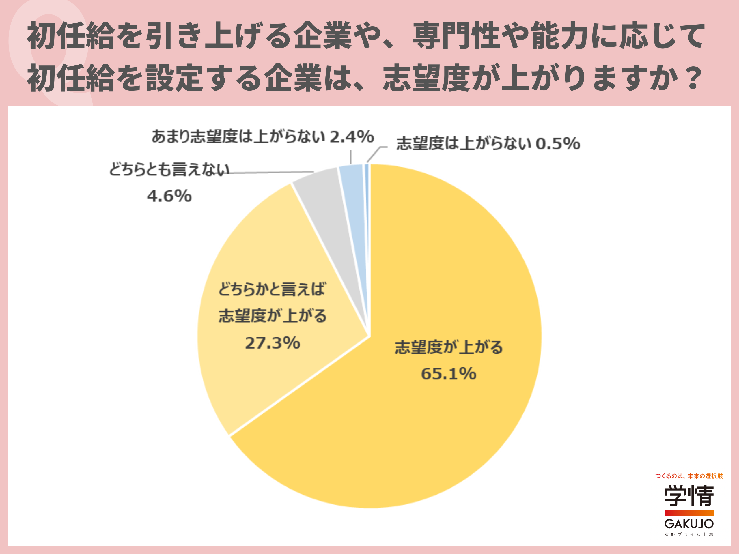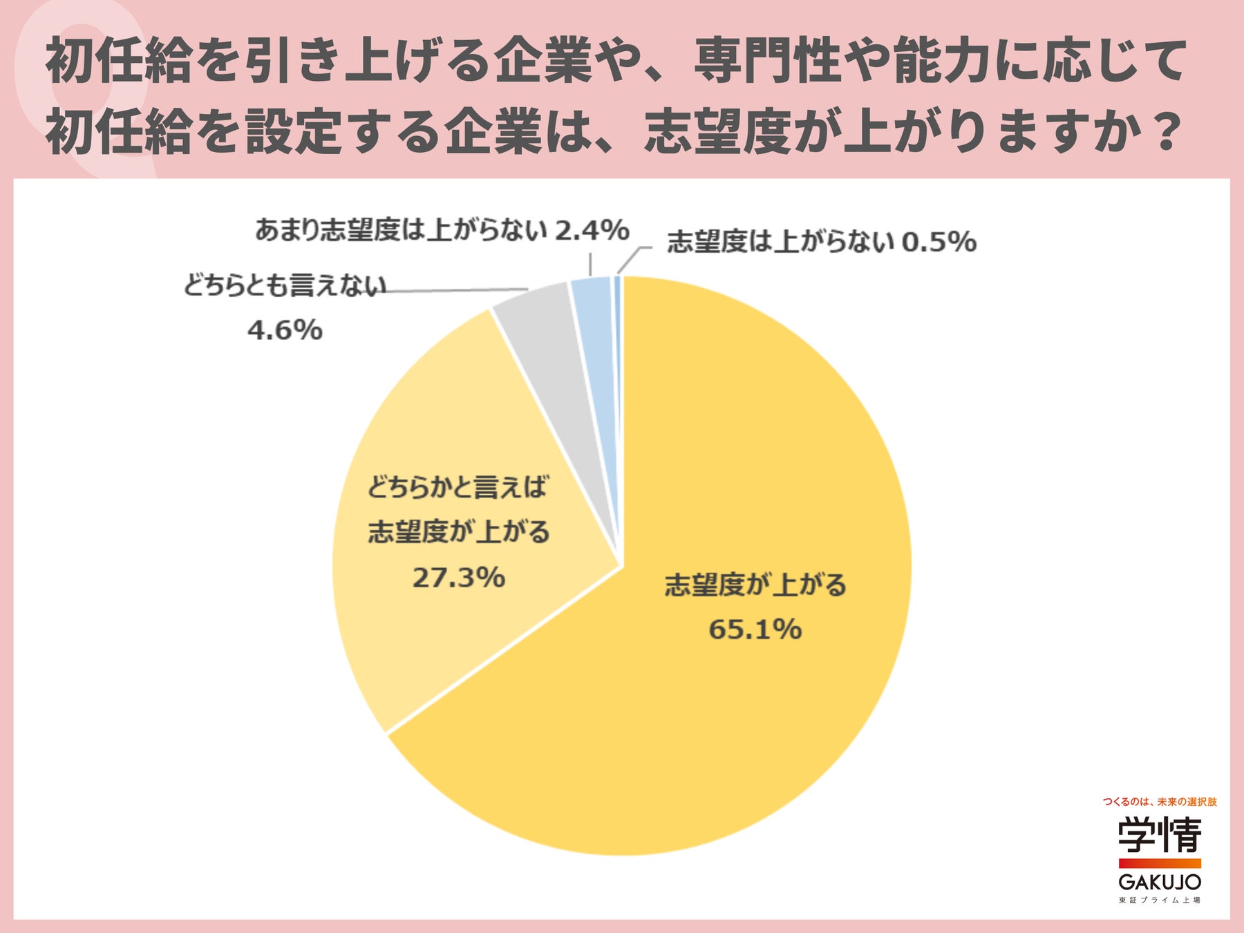 初任給を引き上げる企業や、専門性や能力に応じて初任給を設定する企業について、「志望度が上がる」と回答した学生が65.1%に上りました。「どちらかと言えば志望度が上がる」27.3%を合わせると、9割以上が「初任給を引き上げる企業」、「専門性や能力に応じて初任給を設定する企業」は志望度が上がるとしています。「初任給を引き上げる企業が増えているので、変化に対応している企業は好感が持てる」「企業が個人の能力を評価しようとしていることが分かる」「自身への期待値が分かると嬉しい」「専門性や能力が給与に反映されるのであれば、より知識やスキルを習得するモチベーションになる」といった声が上がりました。