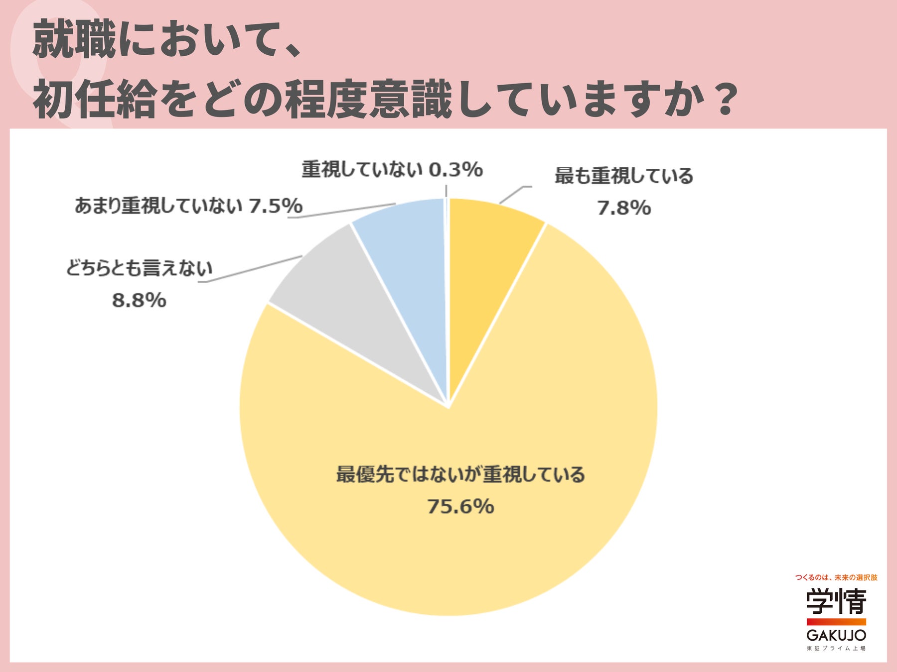 就職において、初任給をどの程度意識するかについて、「最優先ではないが重視している」と回答した学生が、75.6%で最多となりました。「最も重視している」7.8%を合わせると、「重視する」とした学生は8割を超えました。「物価が上がっているので、初任給は重視している」「初任給だけでなく、その後の昇給イメージも重視している」「能力や成果がどの程度給与に反映されるか気になる」といった声が寄せられました。
