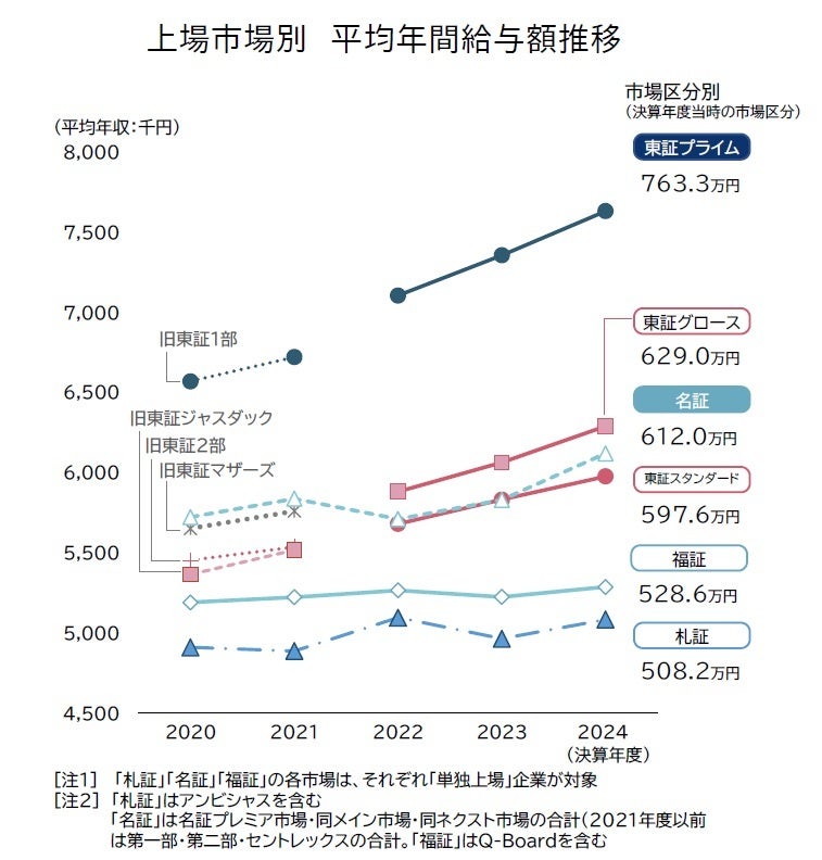 上場市場別にみると、最も平均年間給与が高かったのは「東証プライム(市場)」上場企業で、平均763万3000円となった。次いで高かったのは「東証グロース」の629万円となり、前身となる旧東証ジャスダック・マザーズ両市場時代を含め、2年連続で600万円を超えた。また、全市場(東証・名証・福証)で平均500万円を超えた。全市場のうち、前年度からの伸び率が最も高かったのは「名証」で、5.0%・29.0万円増となった。最も低かったのは「福証」(1.2%・6.3万円増)。