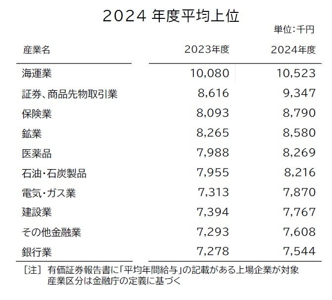 産業別にみると、上場する製造業で平均681万2000円(前年度661万円、+20万2000円・+3.1%)、非製造業で平均665万1000円(前年度645万8000円、+19万3000円・+3.0%)となった。製造業・非製造業ともに、平均給与額および前年度からの増加額が過去20年で最高となった。このうち、最も平均年間給与が高い業界は「海運業」(1052万3000円)だった。全業界で唯一、1000万円を超えた。平均給与額が1400万円台の「商船三井」「日本郵船」(東証プライム)をはじめ、対象となる海運企業すべてで上場企業平均を上回る水準だった。