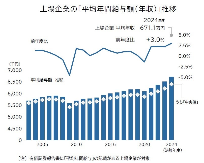 「上場企業」の平均年収、2024年度は671.1万円 「過去20年で最高」更新 4年連続で前年上回る 業界最高は「海運業」の1052万円