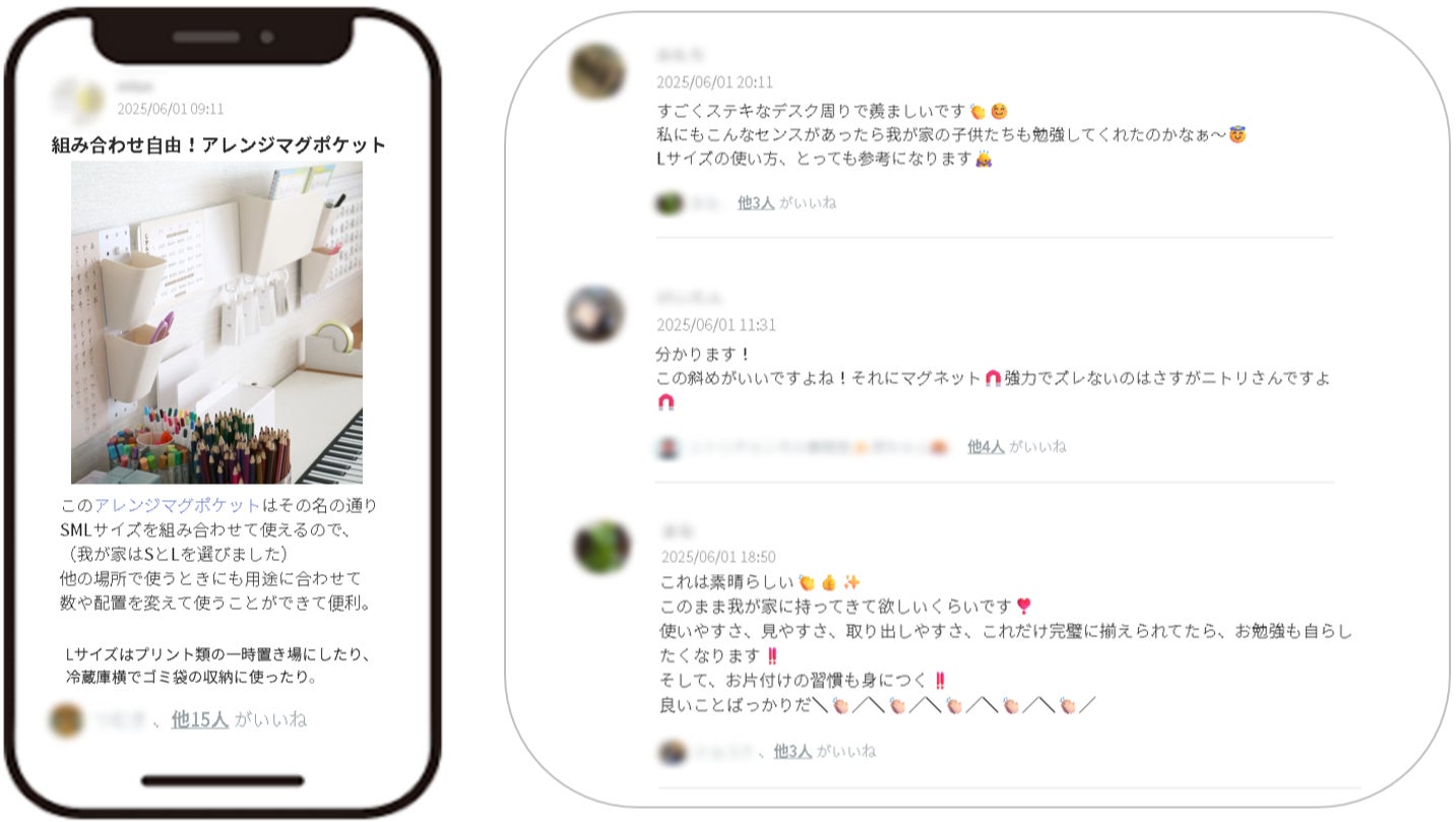 「ニトリチャンネル」は、暮らしの豊かさを“お客様と共創する”オープンなコミュニティサイトとして、インテリアのちょっとした工夫やコーディネートの仕方、収納術などを気軽にシェアいただけます。投稿や交流を通じて、「こんな使い方があったんだ」「それ、やってみたい!」と思える暮らしのコツやアイデアが見つかります。