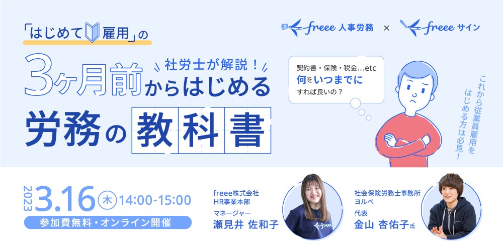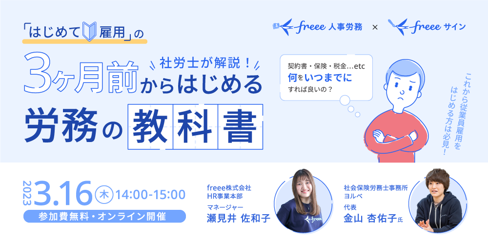 freee株式会社が提供する「freee人事労務」では、初めての雇用をテーマとしたオンライン無料セミナー「『はじめて雇用』の3ヶ月前からはじめる労務の教科書」を2023年3月16日14時より開催します。本セミナーは従業員雇用を検討中の小規模事業所向けに、従業員雇用で必要な5つのSTEPを社労士が解説します。雇用形態を問わず、これから従業員の雇用を予定されている方、雇用をはじめたばかりの方におすすめのセミナーです。