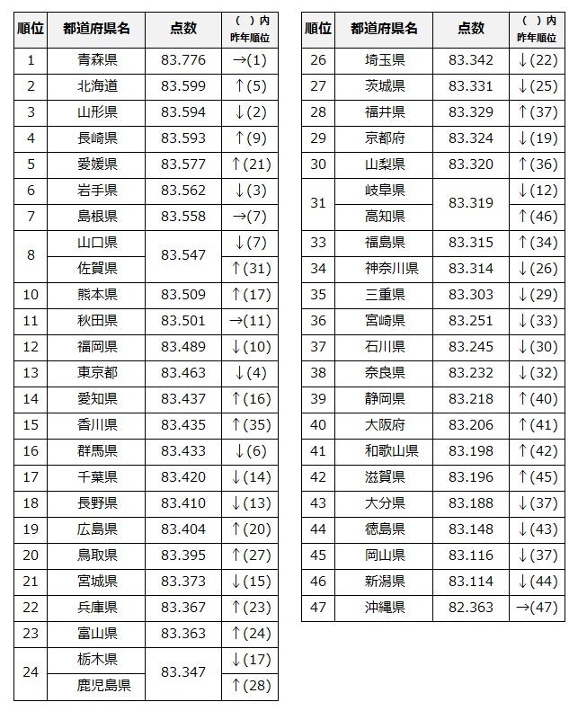 トップ3入りを狙った東京都は13位へと順位を下げる一方、長崎県が4位(昨年9位)、愛媛県が5位(昨年21位)、佐賀県が8位(昨年31位)と大健闘を見せました。