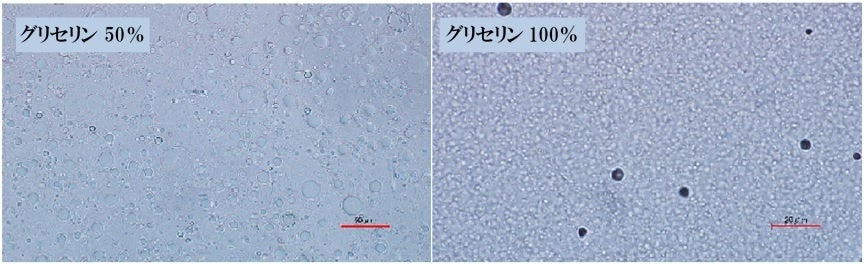 さらに、このグリセリンゲルを光学顕微鏡で観察を行いました。グリセリンの割合が50%の場合、粒径が10から30μm程度の大きな油滴が確認されましたが、グリセリン100%の場合では、粒径が1μm程度の非常に細かい結晶粒子が分散している様子が観察されました(図4)。