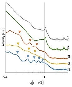 図3 X線を用いた構造解析結果:グリセリン割合が0%から50%(サンプル1、2、3)は、ラメラ構造の際に見られるピークの繰り返し(▼)があることから、ラメラ構造が形成されているが、グリセリン割合が100%のサンプル4、5ではピークが見られず、ラメラ構造が形成されていないことが分かった。