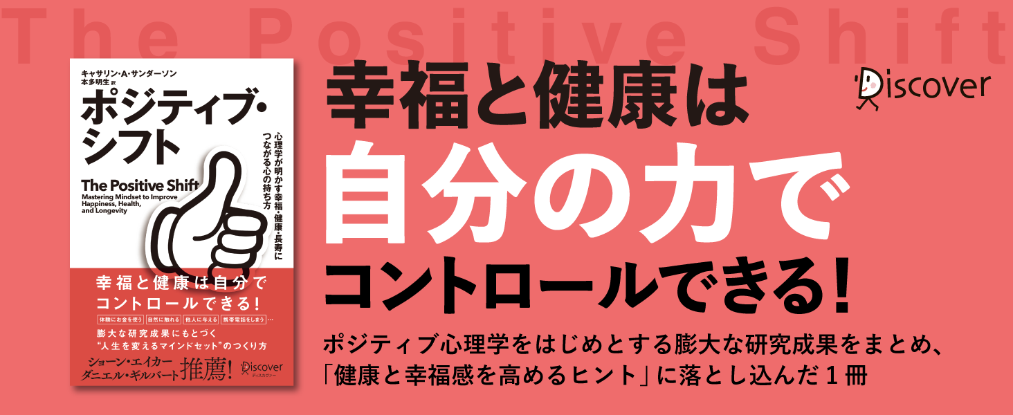 株式会社ディスカヴァー・トゥエンティワン(本社:東京都千代田区、取締役社長:谷口奈緒美)は2023年6月23日に『ポジティブ・シフト 心理学が明かす幸福・健康・長寿につながる心の持ち方』(キャサリン・A・サンダーソン 著、本多明生 訳)を刊行しました。