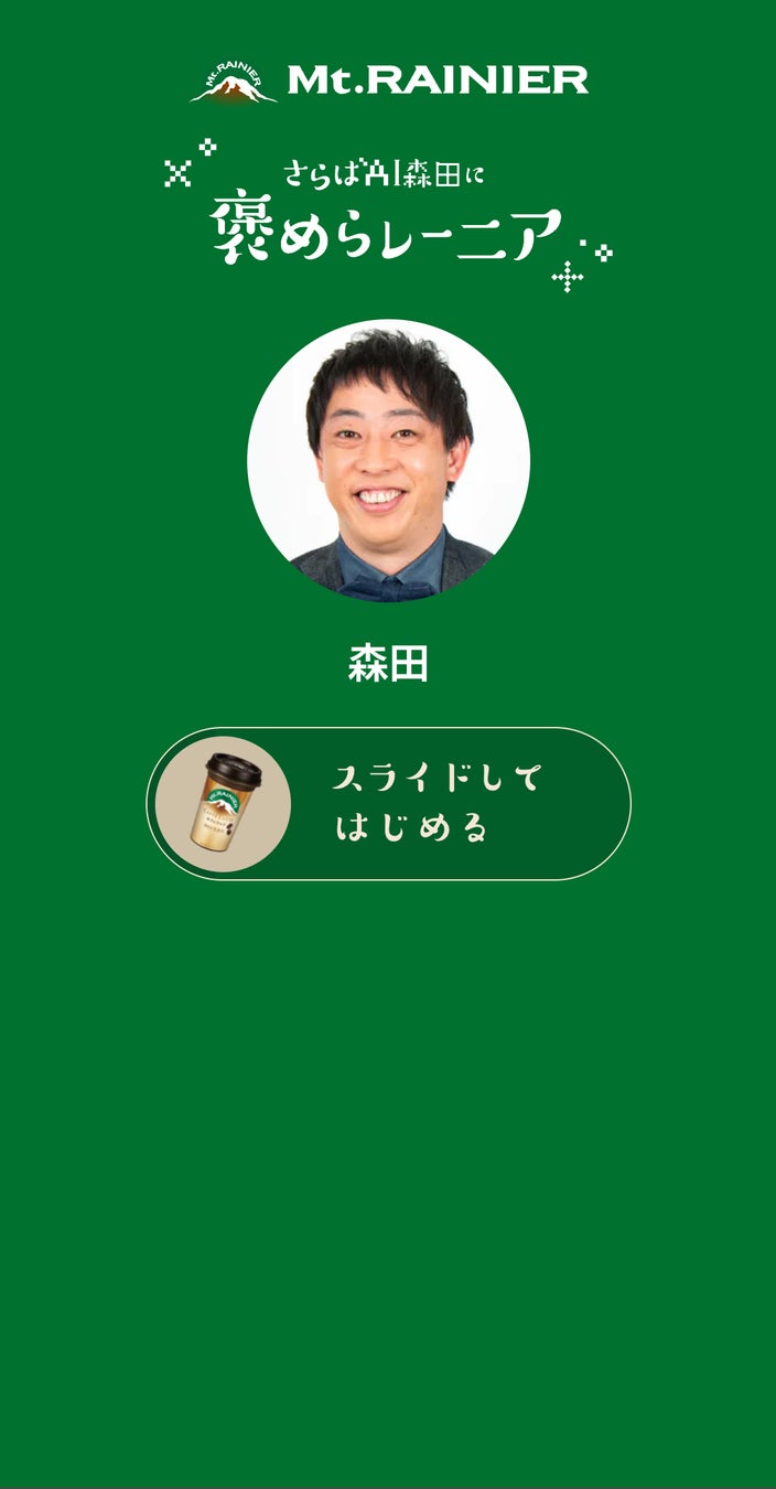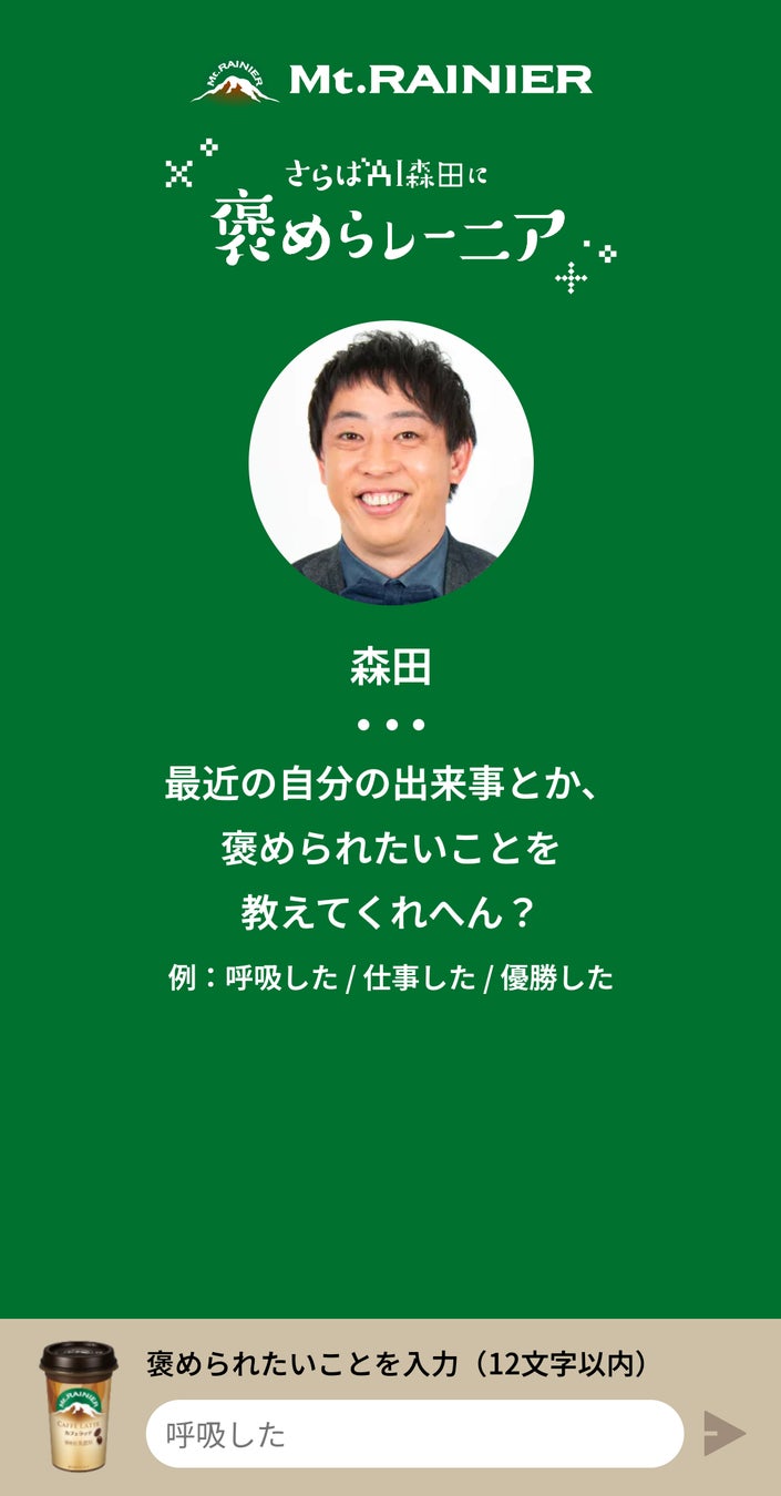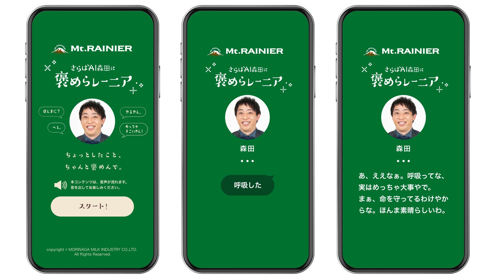 「褒めらレーニア」は、特設サイトにアクセスし“褒められたいこと”を文字で入力すると、大の「マウントレーニア」ファンとして知られる森田さんが画面に登場し、入力内容に合った関西弁の“褒めボイス”がAIで生成されるユニークな体験型コンテンツです。ささやかな出来事ほどテンションが高まり、大きな自慢話ほど冷静になってしまう森田さんの“褒めボイス”に、くすっと笑いながら、どこか温かくやさしい気持ちになる感覚を体験できます。