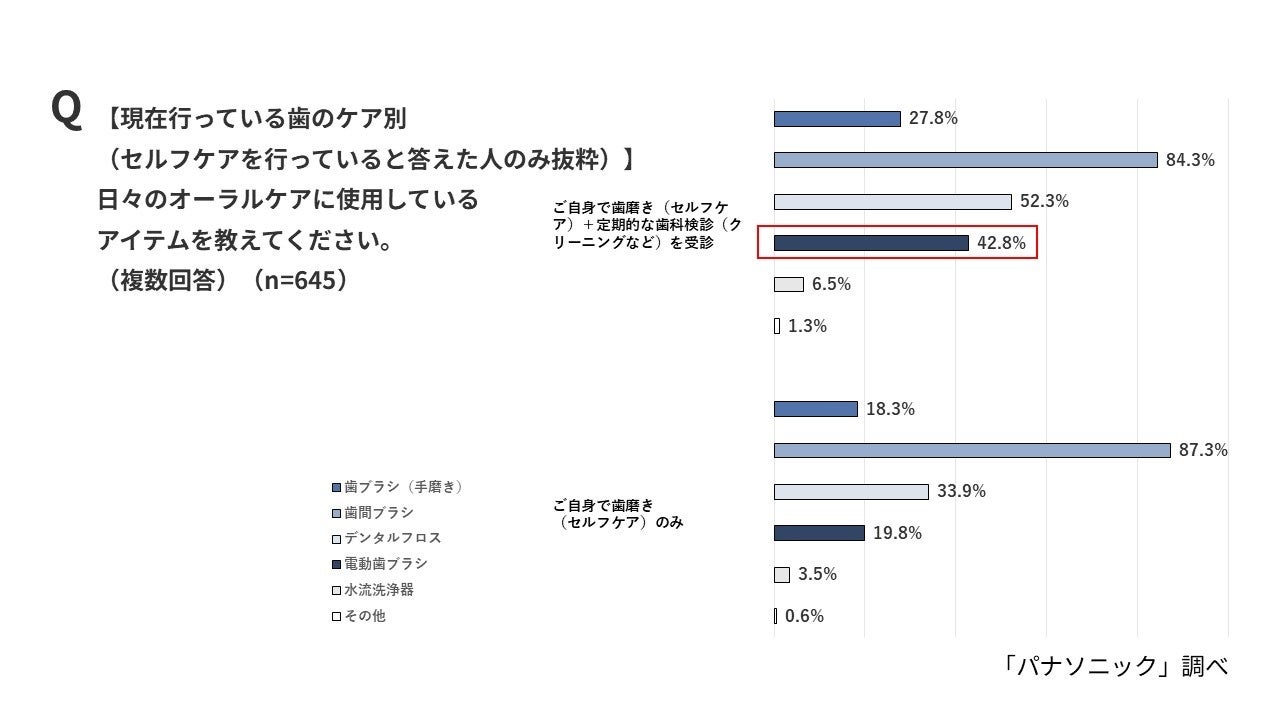 電動歯ブラシの使用率は、プロケア(歯科検診)とセルフケア(ご自身によるケア)のダブルケア実施者は42.8%で、セルフケアのみ実施者(19.8%)の倍以上のスコアとなり、歯の健康意識が高い人ほど、電動歯ブラシを活用する傾向がうかがえます。