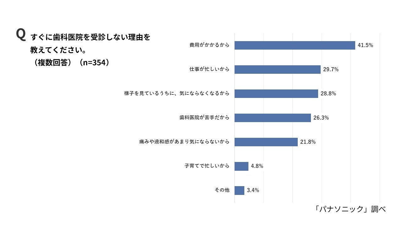 続いて、すぐに歯科医院を受診しない理由を聞いたところ、「費用がかかる(41.5%)」が最も多く、次いで「仕事が忙しい(29.7%)」という結果になりました。