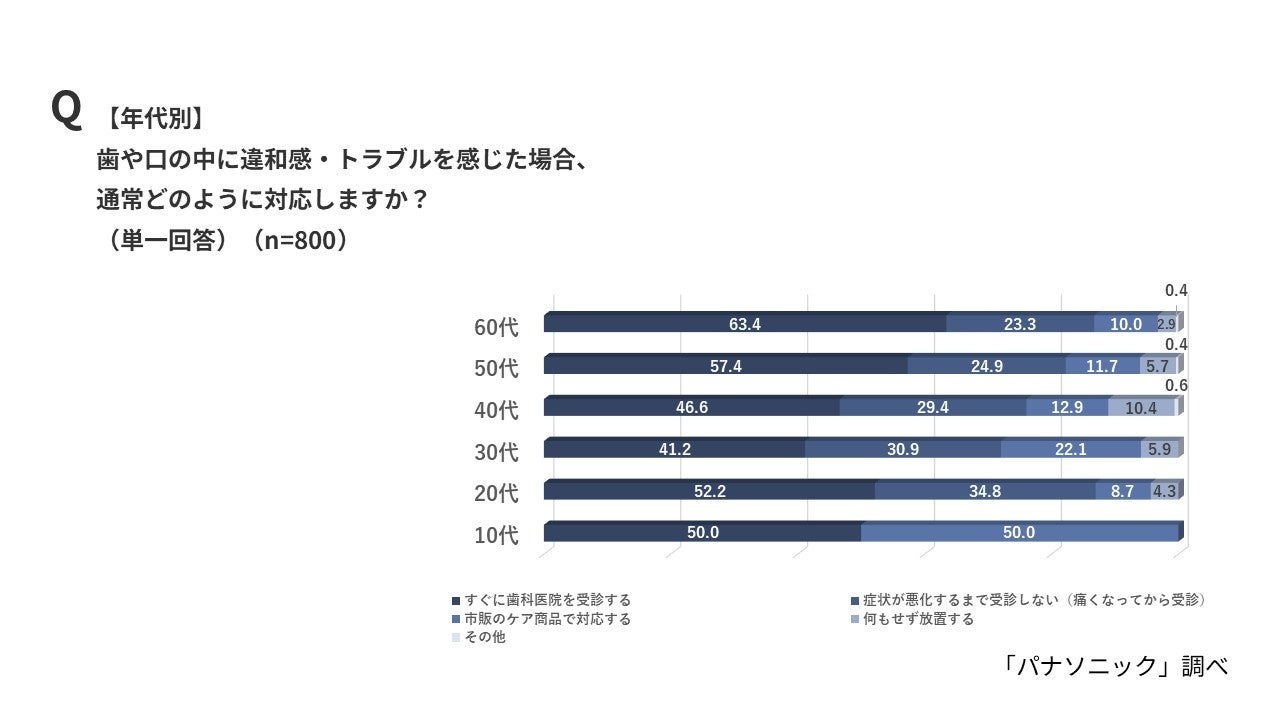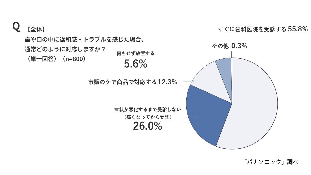 歯や口の中に違和感・トラブルを感じた場合、通常どのように対応するかをたずねたところ、「症状が悪化するまで受診しない(痛くなってから受診)」という人は26.0%。また「何もせず放置する」という人は5.6%で、約3割(合計31.6%)の人がトラブルを感じても放置していることがわかりました。